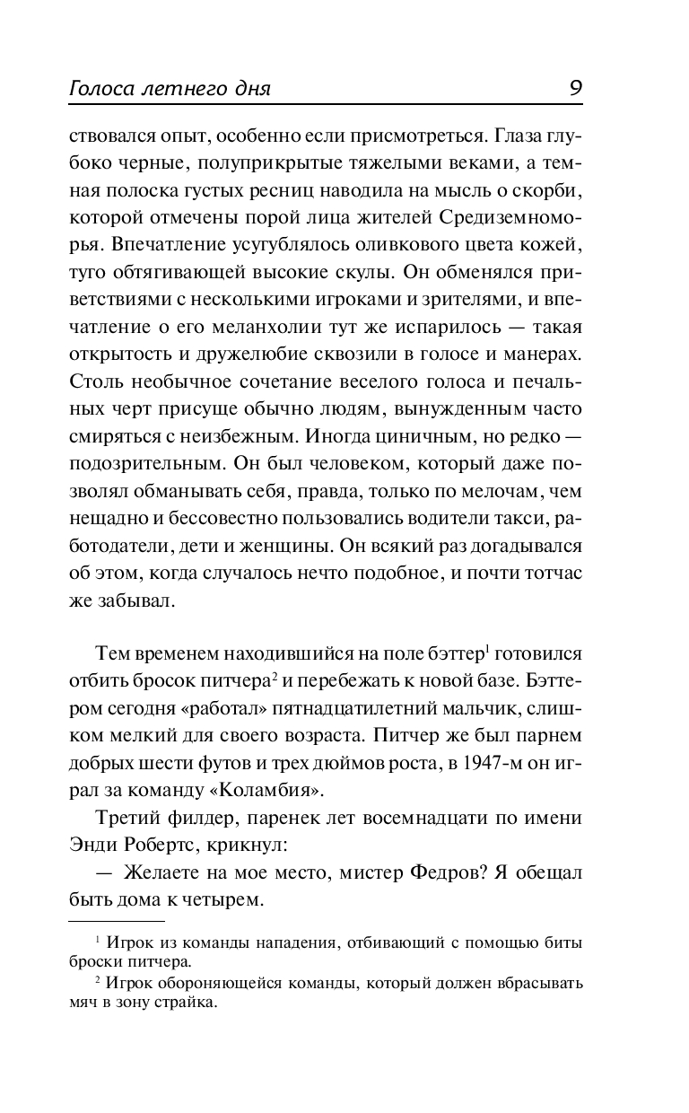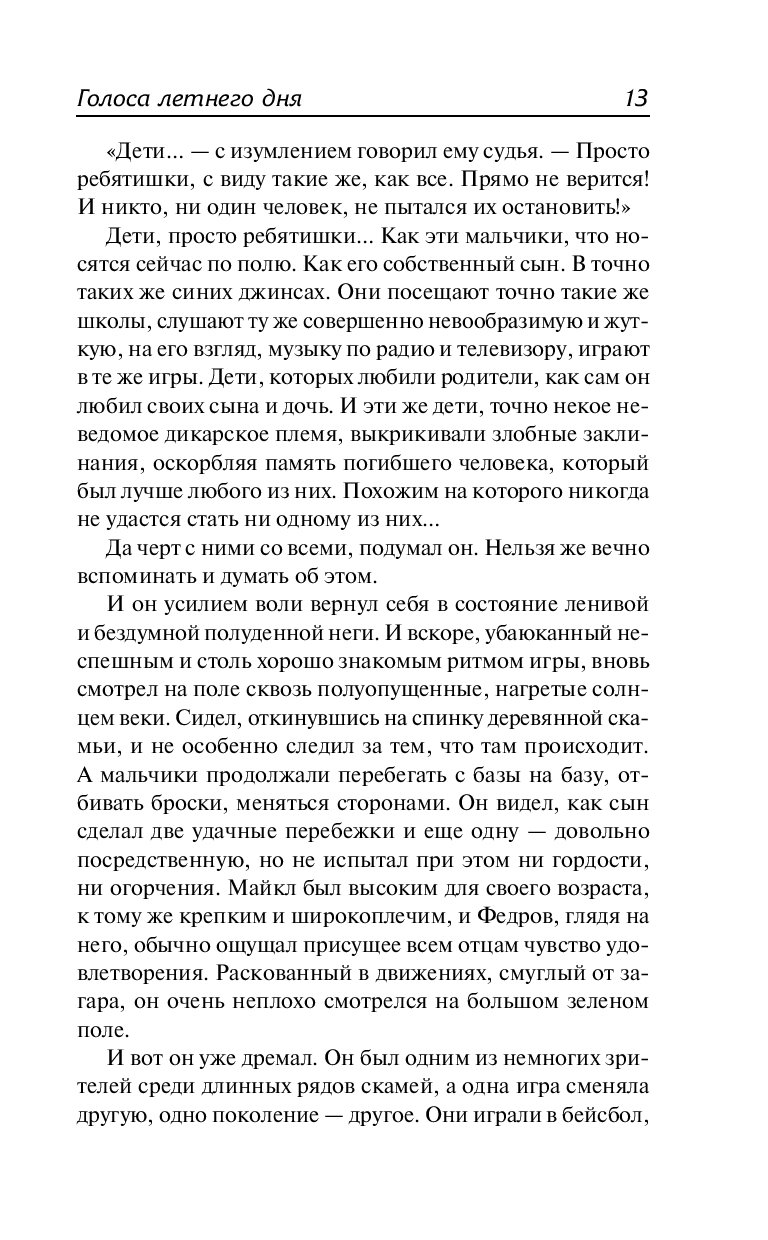 Однажды, наблюдая за бейсбольным матчем своего сына, герой романа "Голоса летнего дня" Бенджамин Федров погружается в воспоминания о собственной молодости, когда он и сам играл в бейсбол. Молодости, которую нельзя назвать беззаботной, ведь на нее пришлись не только первая любовь и большие надежды, но и Великая депрессия, Вторая мировая война и другие тяжелые испытания.
