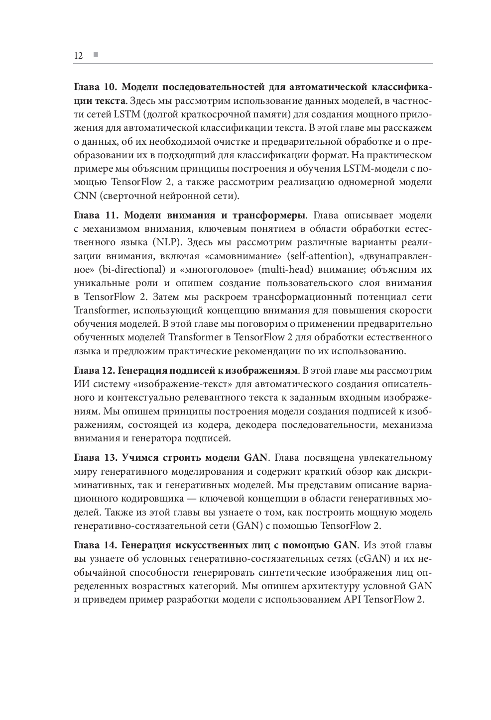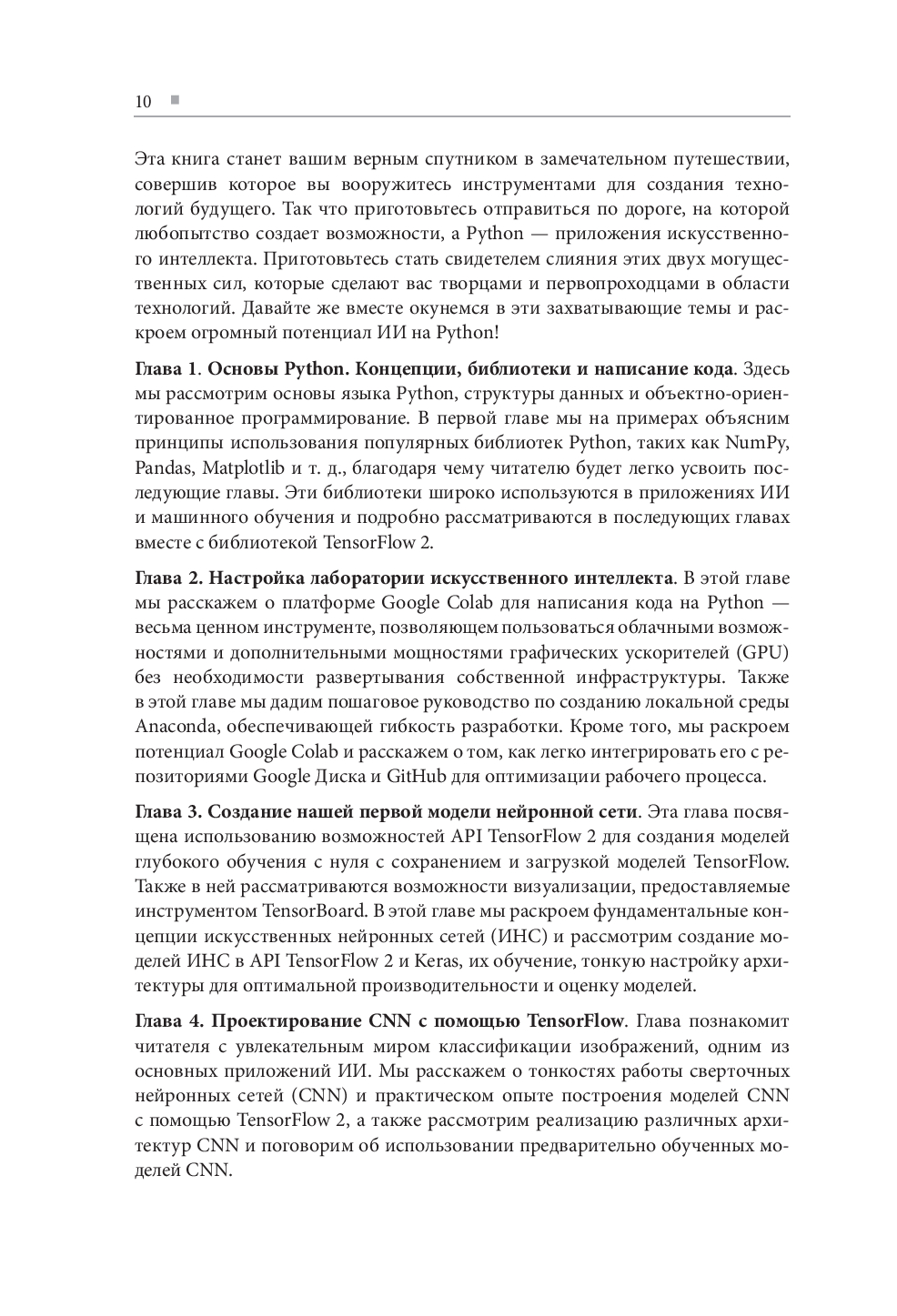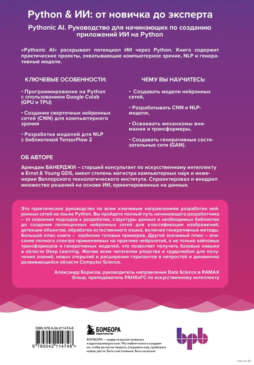 Книга предлагает читателям глубокое погружение в мир искусственного интеллекта с использованием популярного языка программирования Python. Руководство идеально подходит тем, кто хочет освоить ключевые инструменты и методологии, включая CNN для компьютерного зрения и NLP-модели с TensorFlow 2. Предлагаются полезные проекты и продвинутые концепции, такие как механизмы внимания, трансформеры и GAN. Автор делится опытом создания сложных моделей и разработки современных приложений ИИ, делая акцент на практическое освоение технологий.