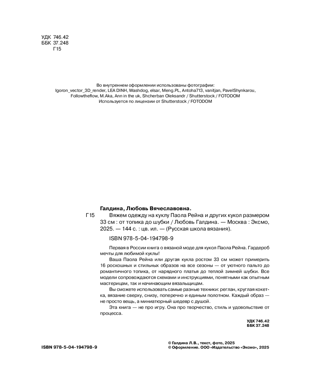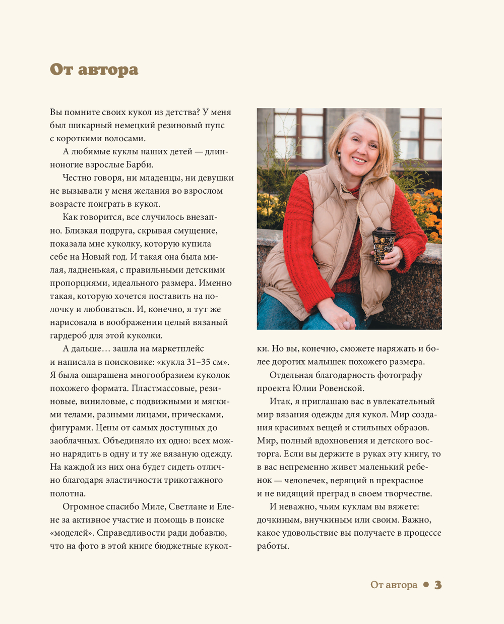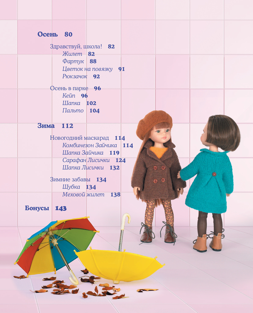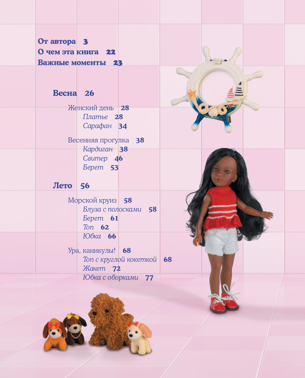 Ваша Паола Рейна или другая кукла ростом 33 см может примерить 16 роскошных и стильных образов на все сезоны – от уютного пальто до романтичного топика, от нарядного платья до теплой зимней шубки. Все модели сопровождаются схемами и инструкциями, понятными как опытным мастерицам, так и начинающим вязальщицам.