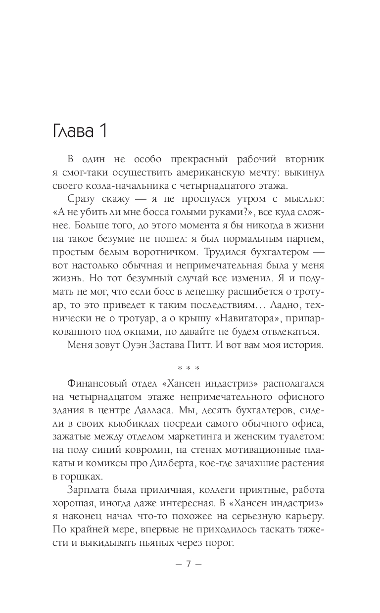 Через пять дней после того, как Оуэн Застава Питт выбросил своего невыносимого босса из окна четырнадцатого этажа, он очнулся в больнице со шрамом на лице, невероятными воспоминаниями и предложением о работе.