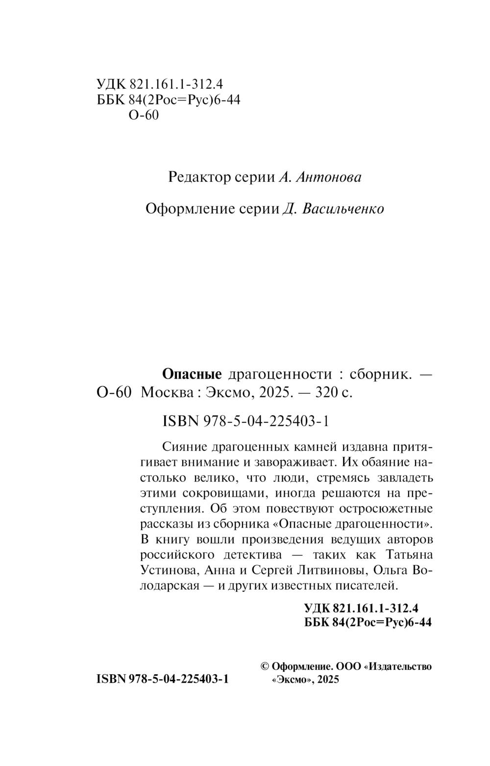 Сияние драгоценных камней издавна притягивает внимание и завораживает. Их обаяние настолько велико, что люди, стремясь завладеть этими сокровищами, иногда решаются на преступления. Об этом повествуют остросюжетные рассказы из сборника "Опасные драгоценности". В книгу вошли произведения ведущих авторов российского детектива – таких как Татьяна Устинова, Анна и Сергей Литвиновы, Ольга Володарская – и других известных писателей.