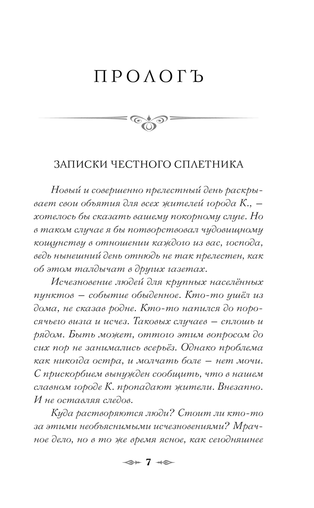Туманный город К., конец XIX века. На улицах исчезают люди – бесследно, без шума, без объяснений. Пока полиция твердит о случайностях, графиня Ельская, медиум и хозяйка спиритического салона, получает зловещие послания и чувствует: в этом замешано нечто потустороннее. Следователь Одоевский расследует исчезновения, но реальных зацепок всё меньше, а атмосфера сгущается с каждым днём. Могут ли мёртвые рассказать больше, чем живые? Или сам город скрывает того, кто охотится по ночам?
