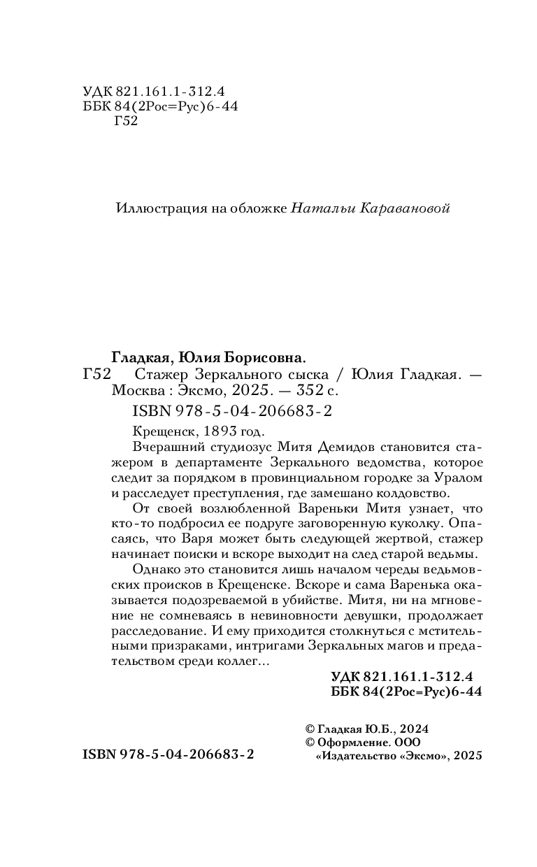 Однако это становится лишь началом череды ведьмовских происков в Крещенске. Вскоре и сама Варенька оказывается подозреваемой в убийстве. Митя, ни на мгновение не сомневаясь в невиновности девушки, продолжает расследование. И ему приходится столкнуться с мстительными призраками, интригами Зеркальных магов и предательством среди коллег…
