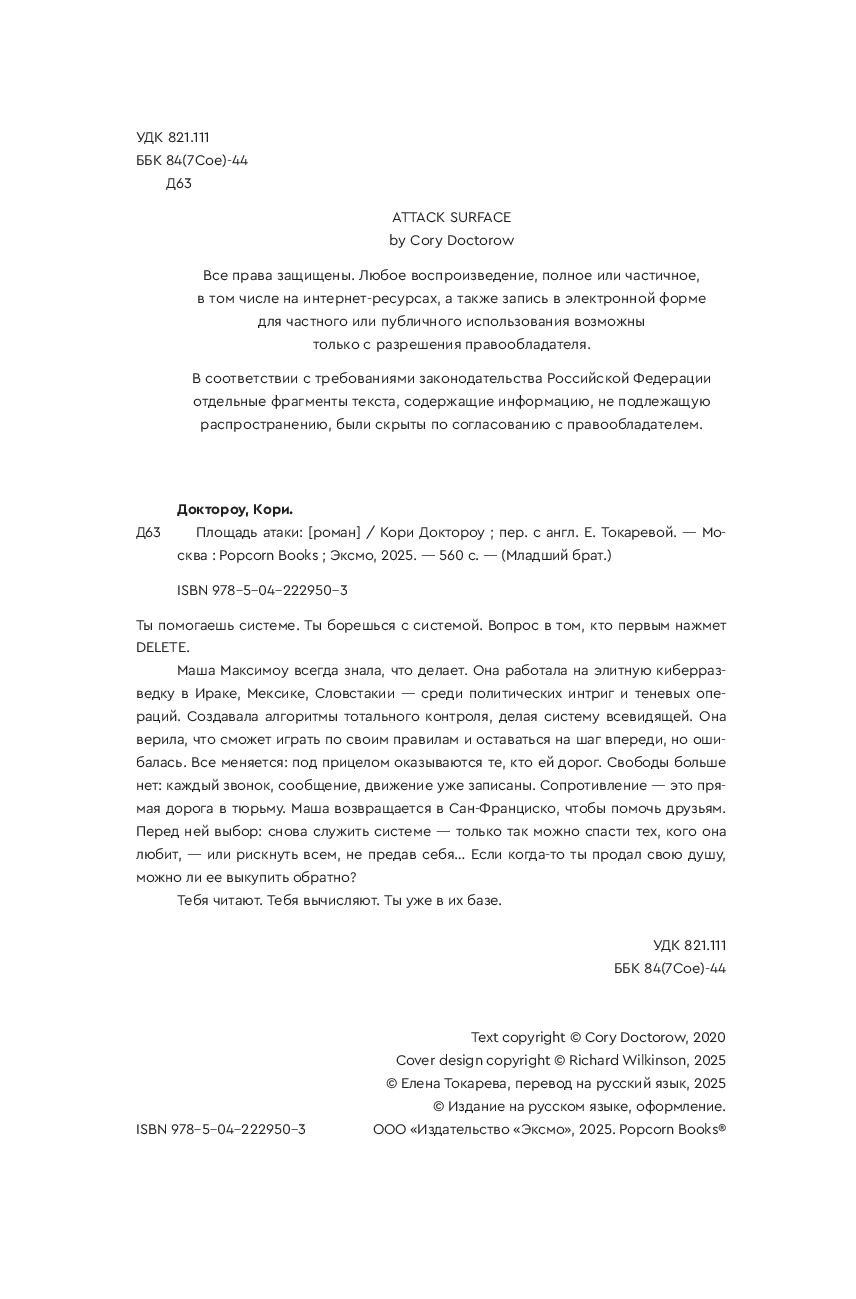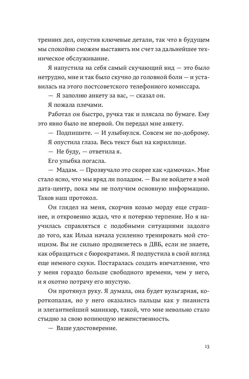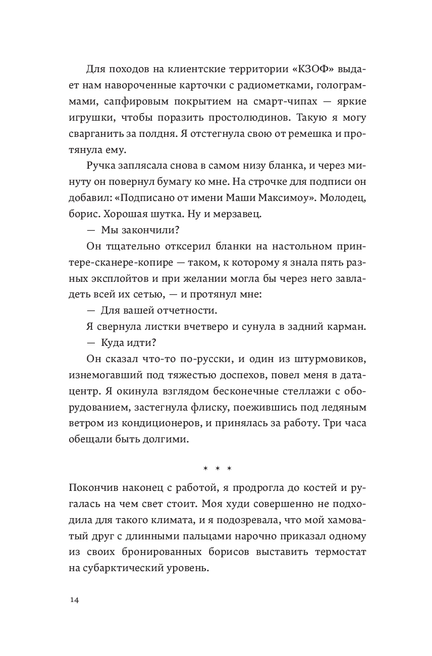 Маша Максимоу всегда знала, что делает. Она работала на элитную киберразведку в Ираке, Мексике, Словакии – среди политических интриг и теневых операций. Создавала алгоритмы тотального контроля, делая систему всевидящей. Она верила, что сможет играть по своим правилам и оставаться на шаг впереди, но ошибалась. Все меняется: под прицелом оказываются те, кто ей дорог. Свободы больше нет: каждый звонок, сообщение, движение уже записаны. Сопротивление – это прямая дорога в тюрьму. Маша возвращается в Сан-Франциско, чтобы помочь друзьям. Перед ней выбор: снова служить системе – только так можно спасти тех, кого она любит, или рискнуть всем, не предав себя… Если когда-то ты продал свою душу, можно ли ее выкупить обратно?