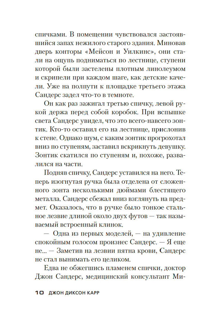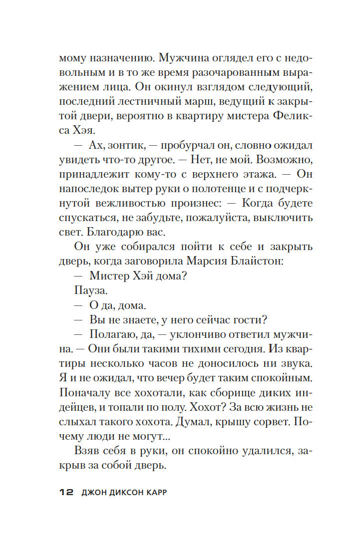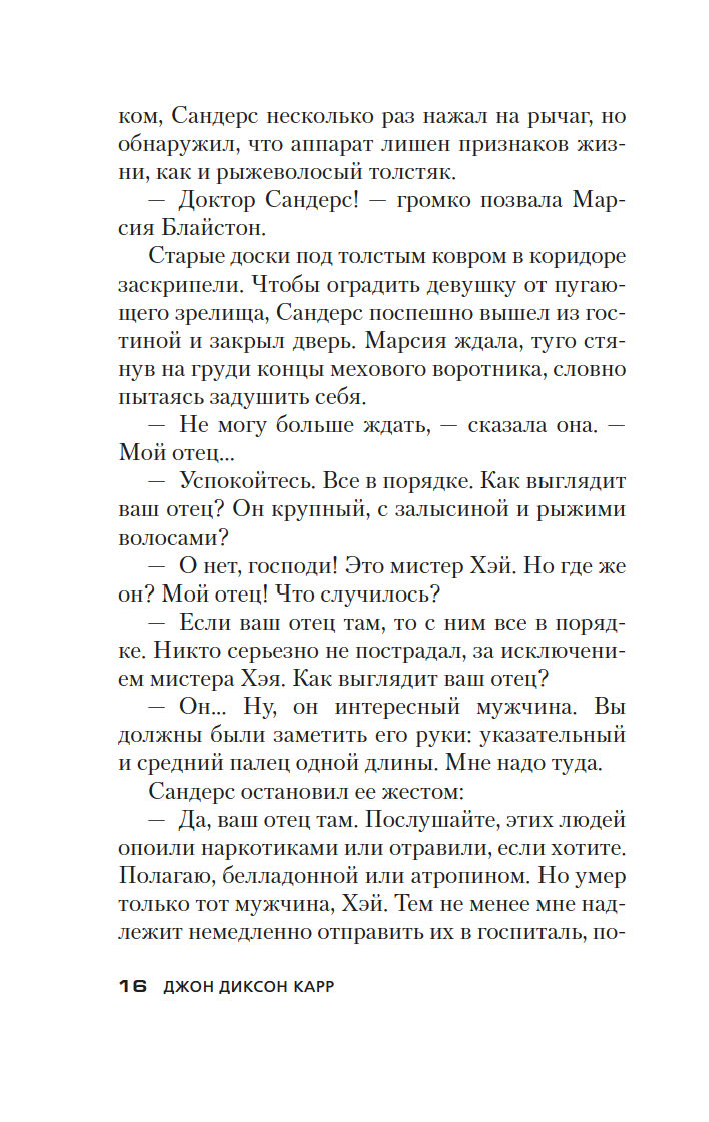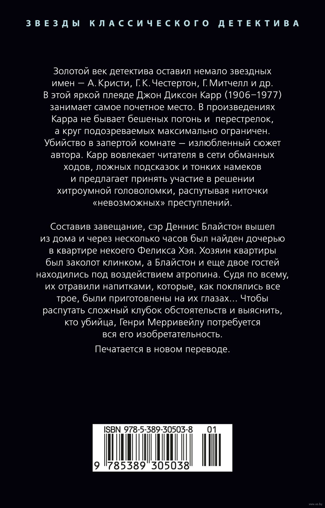 Золотой век детектива оставил немало звездных имен – А. Кристи, Г. К. Честертон, Г. Митчелл и др. В этой яркой плеяде Джон Диксон Карр (1906–1977) занимает самое почетное место. В произведениях Карра не бывает бешеных погонь и перестрелок, а круг подозреваемых максимально ограничен. Убийство в запертой комнате – излюбленный сюжет автора. Карр вовлекает читателя в сети обманных ходов, ложных подсказок и тонких намеков и предлагает принять участие в решении хитроумной головоломки, распутывая ниточки «невозможных» преступлений.