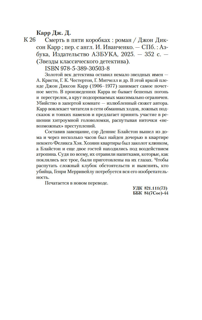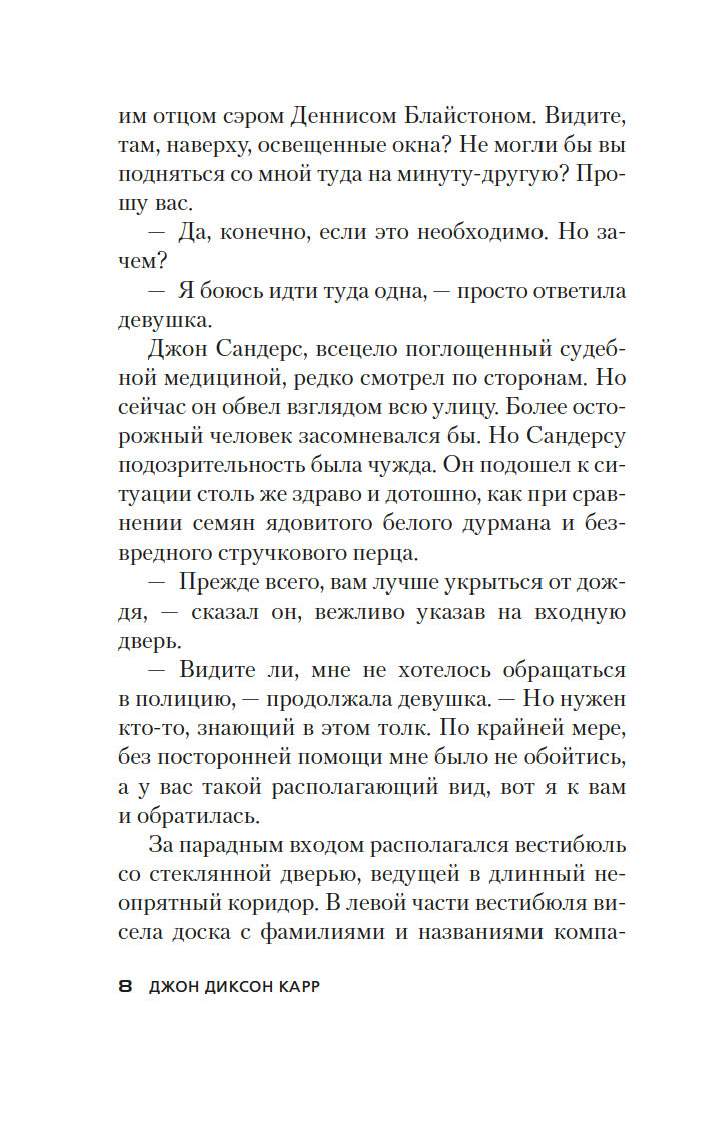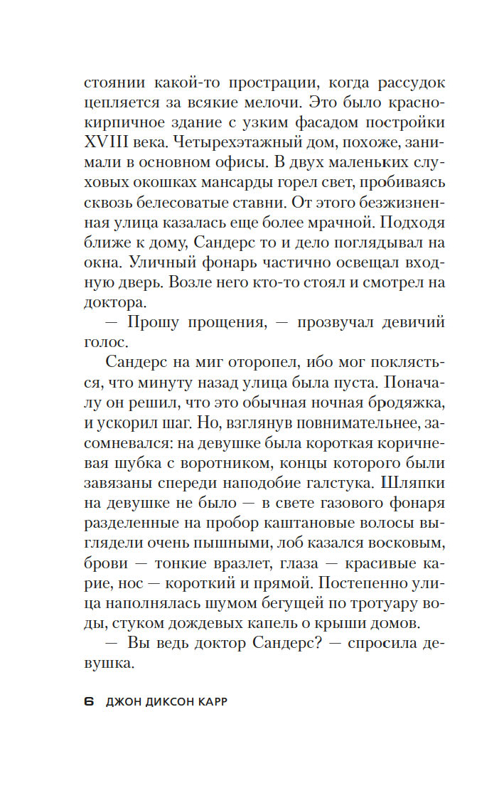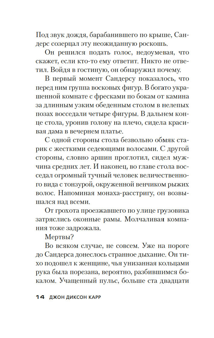 Золотой век детектива оставил немало звездных имен – А. Кристи, Г. К. Честертон, Г. Митчелл и др. В этой яркой плеяде Джон Диксон Карр (1906–1977) занимает самое почетное место. В произведениях Карра не бывает бешеных погонь и перестрелок, а круг подозреваемых максимально ограничен. Убийство в запертой комнате – излюбленный сюжет автора. Карр вовлекает читателя в сети обманных ходов, ложных подсказок и тонких намеков и предлагает принять участие в решении хитроумной головоломки, распутывая ниточки «невозможных» преступлений.