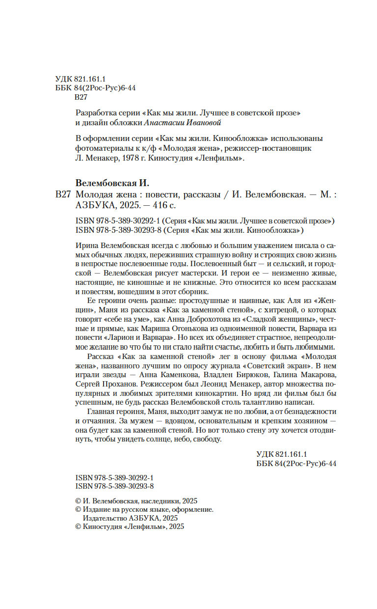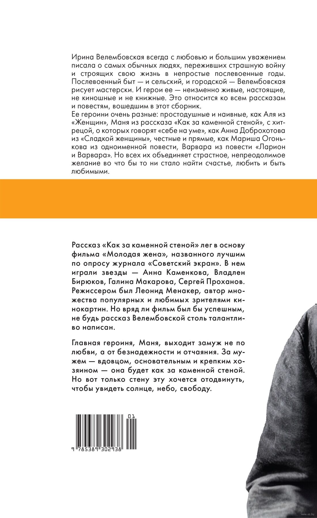 Фильм "Молодая жена", снятый по рассказу Ирины Велембовской "За каменной стеной", стал лучшим фильмом 1980 года по опросу журнала "Советский экран". Конечно, в нем играли звезды советского кинематографа – Анна Каменкова, Владлен Бирюков, Галина Макарова, Сергей Проханов. Режиссером был Леонид Менакер, автор множества популярных и любимых кинокартин. Но вряд ли фильм был бы успешным, не будь рассказ, ставший основой сценария, столь талантливо написанным.