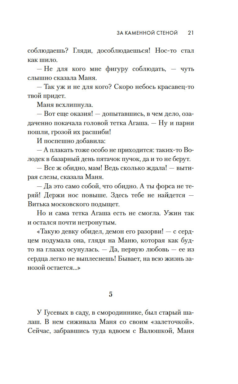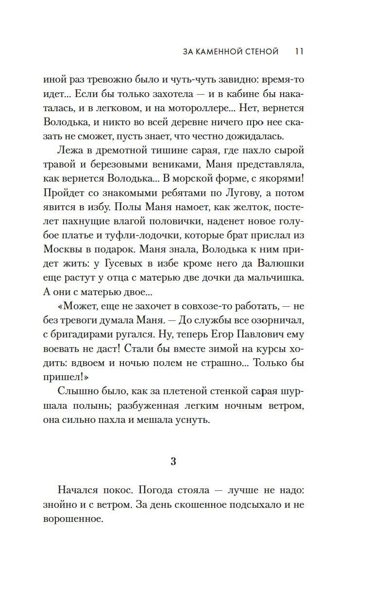 Главная героиня, Маня, выходит замуж не по любви, а от безнадежности и отчаяния. За мужем – вдовцом, основательным и крепким хозяином, – она будет как за каменной стеной. Но вот только стену эту хочется отодвинуть, чтобы увидеть солнце, небо, свободу.