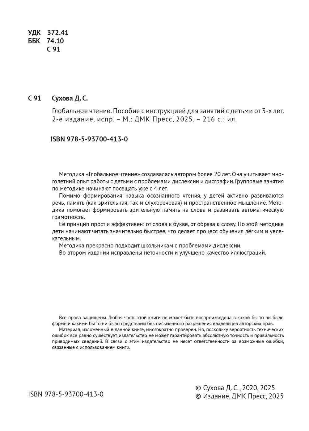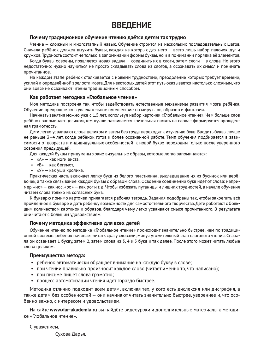 Методика "Глобальное чтение" создавалась автором более 20 лет и учитывает многолетний опыт работы с детьми с проблемами дислексии и дисграфии. Групповые занятия по методике начинают посещать уже с 4 лет. Помимо формирования навыка осознанного чтения, у детей активно развиваются речь, память (как зрительная, так и слухоречевая) и пространственное мышление.