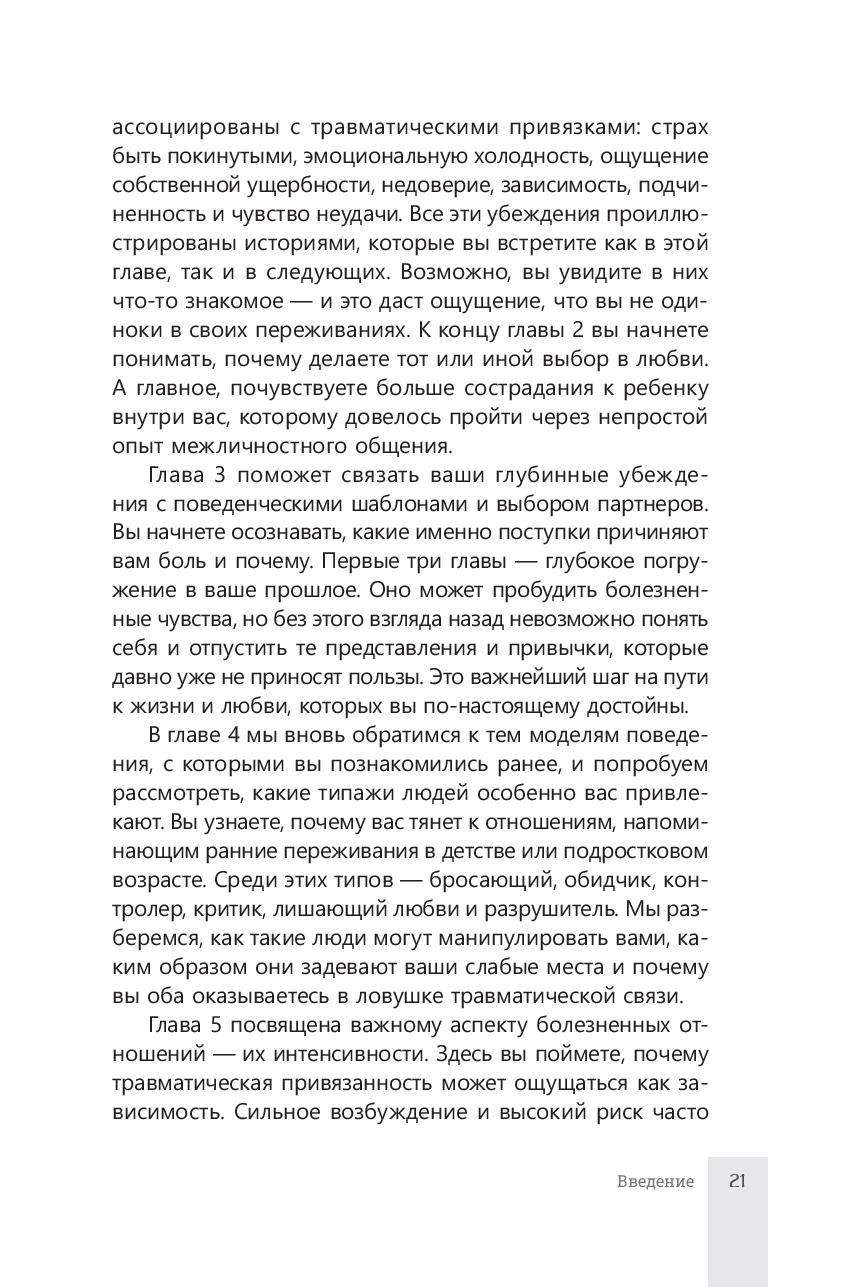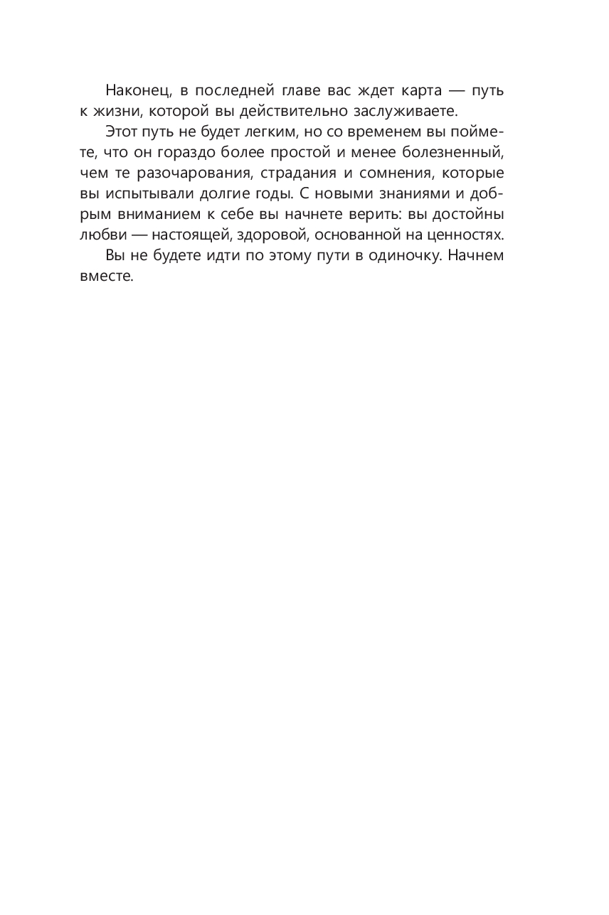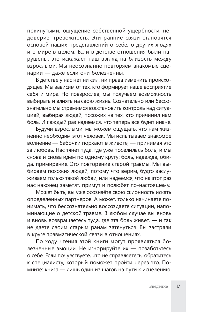 Это повторение старой травмы. Мы выбираем похожих людей, потому что верим, что заслуживаем лишь такую любовь, или надеемся, что в этот раз нас наконец заметят, примут и полюбят по-настоящему. Возможно, вы уже начали осознавать, что ищете определенный тип партнеров. Или только начинаете понимать, что бессознательно воспроизводите ситуации, напоминающие о вашей детской травме. В любом случае, вы вновь и вновь возвращаетесь туда, где эта боль живет, и не даете своим старым ранам зажить.