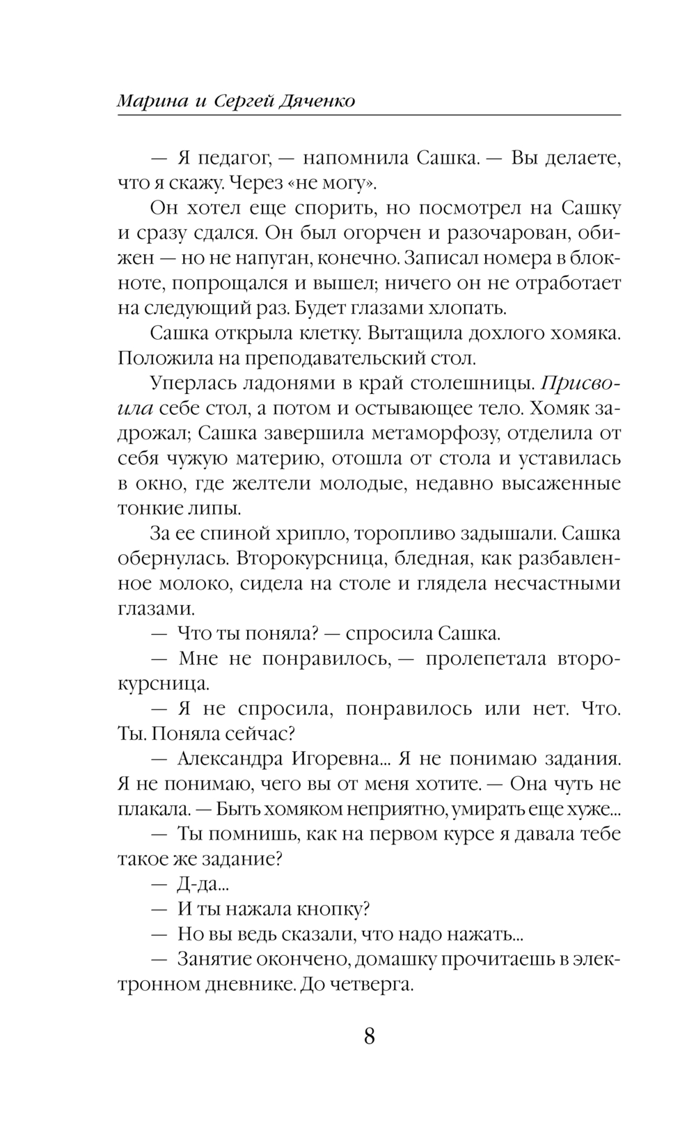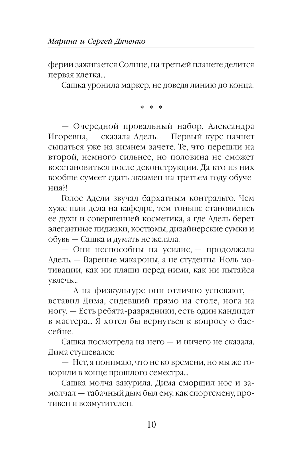 Сашка Самохина, когда-то испуганная первокурсница, становится всемогущим ректором Института специальных технологий. Когда-то она поражалась жестокости преподавателей – теперь сама не знает пощады. Когда-то она не верила, что будет убийцей реальности – теперь миру придет конец, если Сашка не соберет вовремя осколки, фрагменты своей прежней личности.