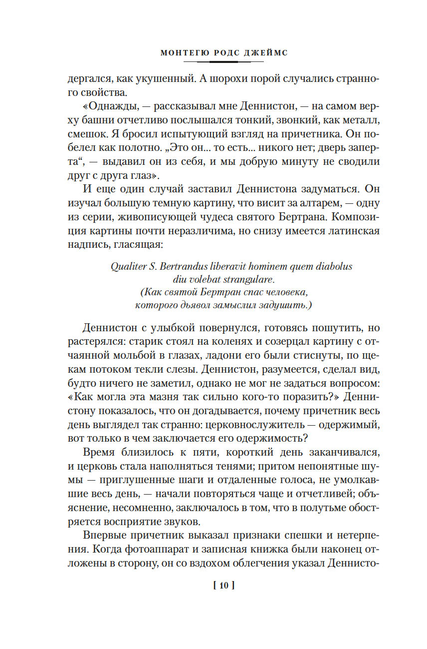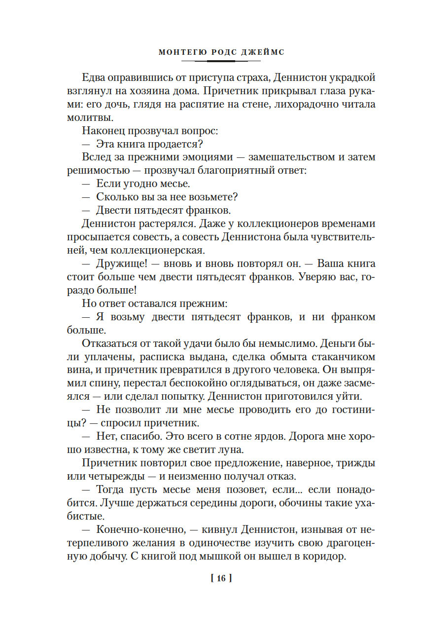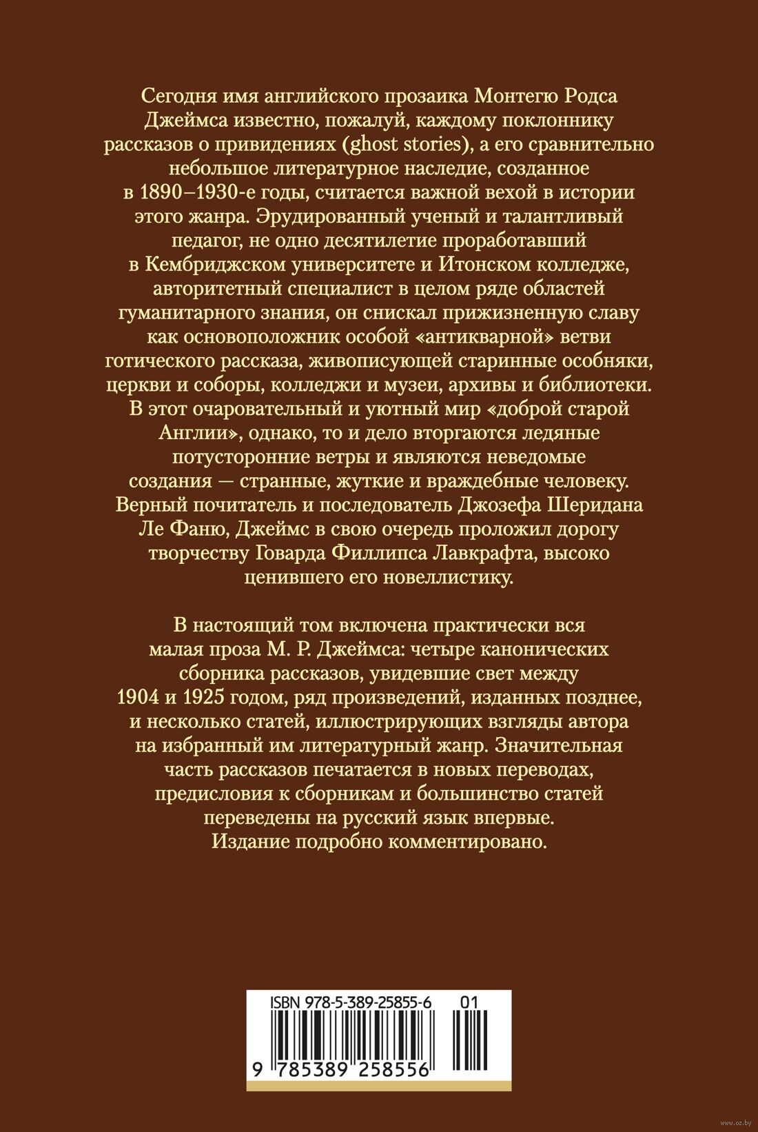 В настоящий том включена практически вся малая проза М. Р. Джеймса: четыре канонических сборника рассказов, увидевшие свет между 1904 и 1925 годом, ряд произведений, изданных позднее, и несколько статей, иллюстрирующих взгляды автора на избранный им литературный жанр. Значительная часть рассказов печатается в новых переводах, предисловия к сборникам и большинство статей переведены на русский язык впервые. Издание подробно комментировано.