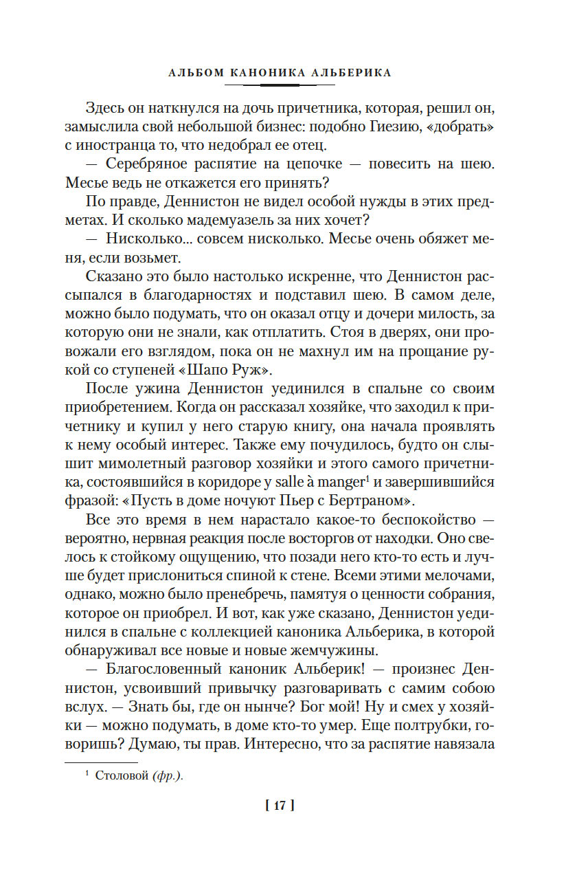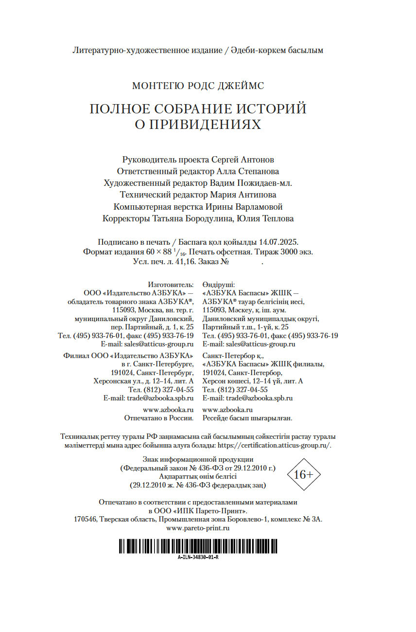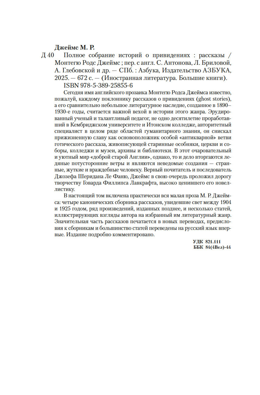 В настоящий том включена практически вся малая проза М. Р. Джеймса: четыре канонических сборника рассказов, увидевшие свет между 1904 и 1925 годом, ряд произведений, изданных позднее, и несколько статей, иллюстрирующих взгляды автора на избранный им литературный жанр. Значительная часть рассказов печатается в новых переводах, предисловия к сборникам и большинство статей переведены на русский язык впервые. Издание подробно комментировано.