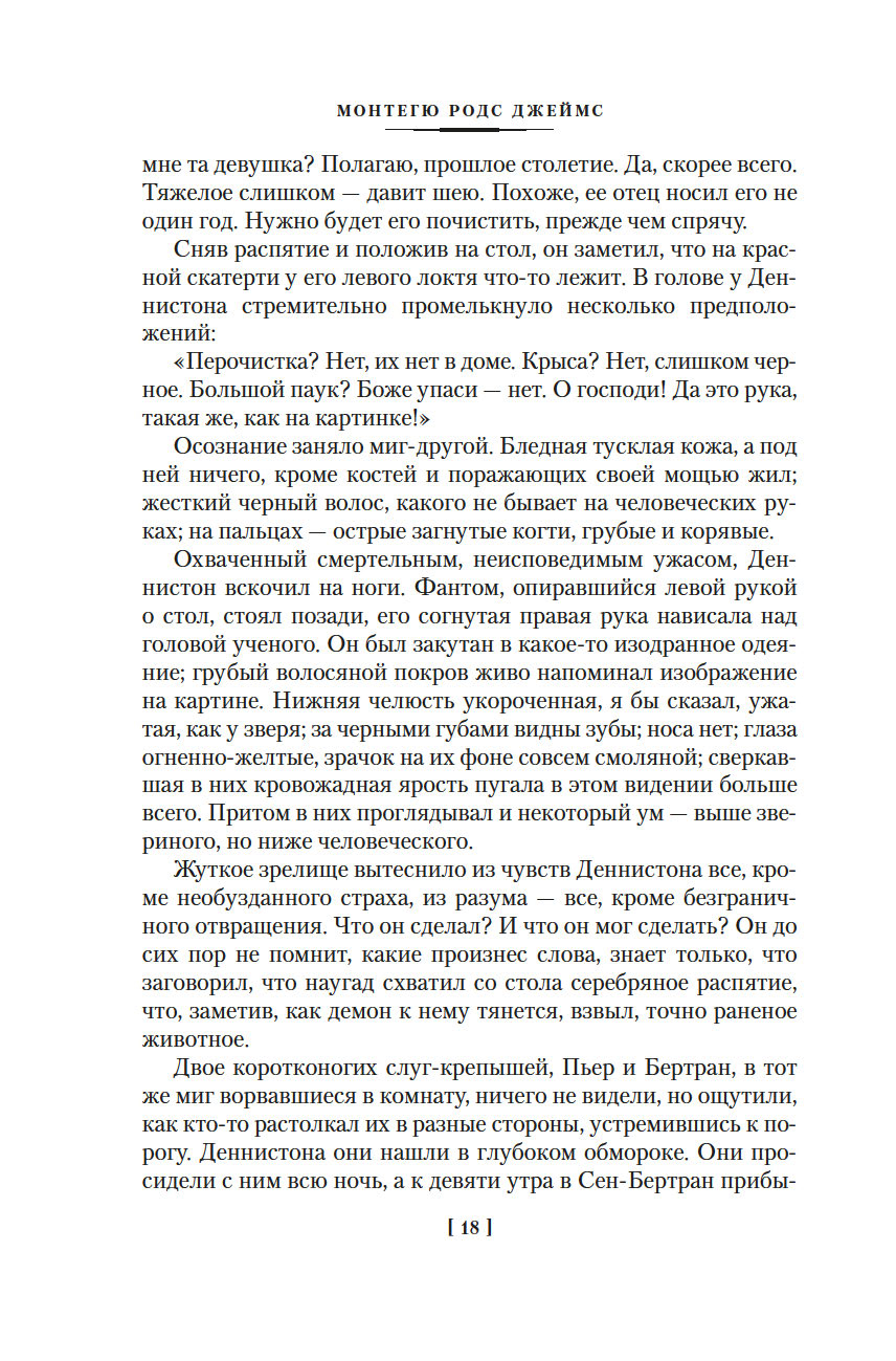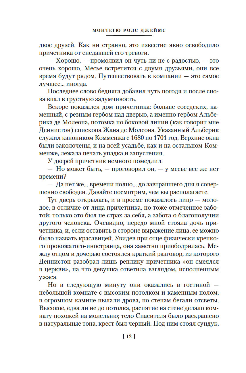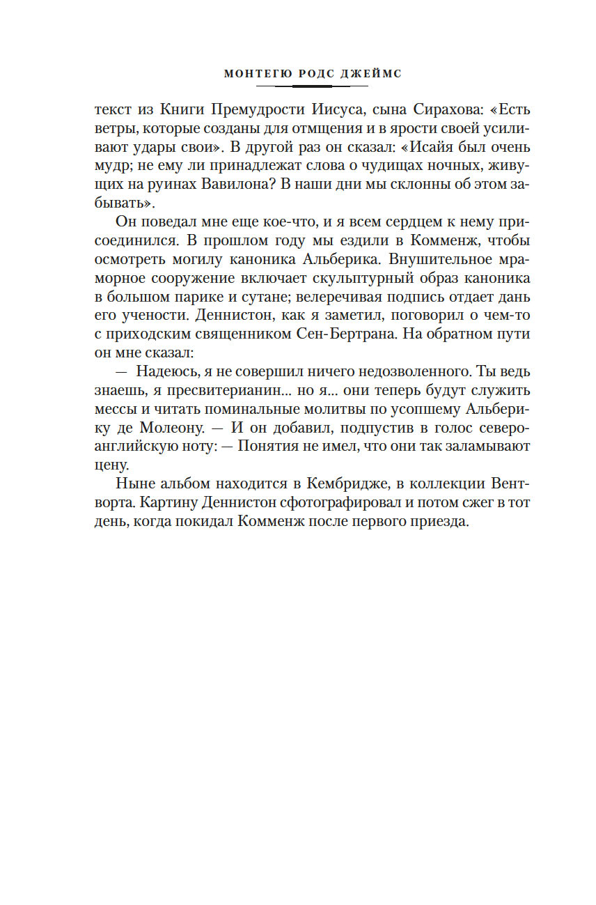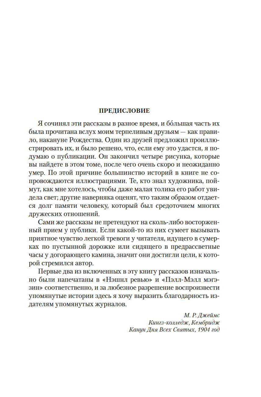 Сегодня имя английского прозаика Монтегю Родса Джеймса известно, пожалуй, каждому поклоннику рассказов о привидениях (ghost stories), а его сравнительно небольшое литературное наследие, созданное в 1890–1930-е годы, считается важной вехой в истории этого жанра. Эрудированный ученый и талантливый педагог, не одно десятилетие проработавший в Кембриджском университете и Итонском колледже, авторитетный специалист в целом ряде областей гуманитарного знания, он снискал прижизненную славу как основоположник особой "антикварной" ветви готического рассказа, живописующей старинные особняки, церкви и соборы, колледжи и музеи, архивы и библиотеки. В этот очаровательный и уютный мир "доброй старой Англии", однако, то и дело вторгаются ледяные потусторонние ветры и являются неведомые создания – странные, жуткие и враждебные человеку. Верный почитатель и последователь Джозефа Шеридана Ле Фаню, Джеймс в свою очередь проложил дорогу творчеству Говарда Филлипса Лавкрафта, высоко ценившего его новеллистику.