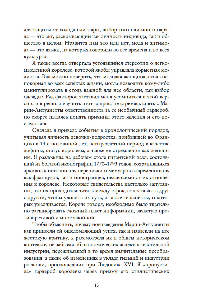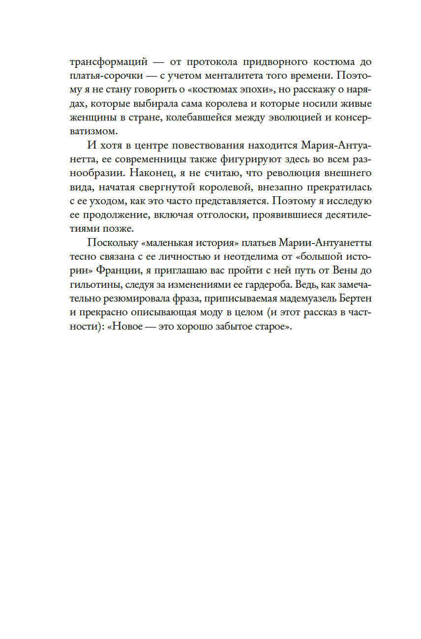 "Сначала ее с радостью встречали в Тюильри парижанки, выпрашивавшие цветы и ленты с ее шляпы, пока парижане удивлялись ее достоинству, простоте и заботе о детях. Затем ее освистывали, втаптывали в грязь, лишали человеческого облика – так продолжалось до самого последнего акта трагедии, в котором ее смерть превратили в представление, увековечив ее образ в розово-черных тонах… Поскольку "маленькая история" платьев Марии-Антуанетты тесно связана с ее личностью и неотделима от "большой истории" Франции, я приглашаю вас пройти с ней путь от Вены до гильотины, следуя за изменениями ее гардероба" (Сильви Ле Бра-Шово).