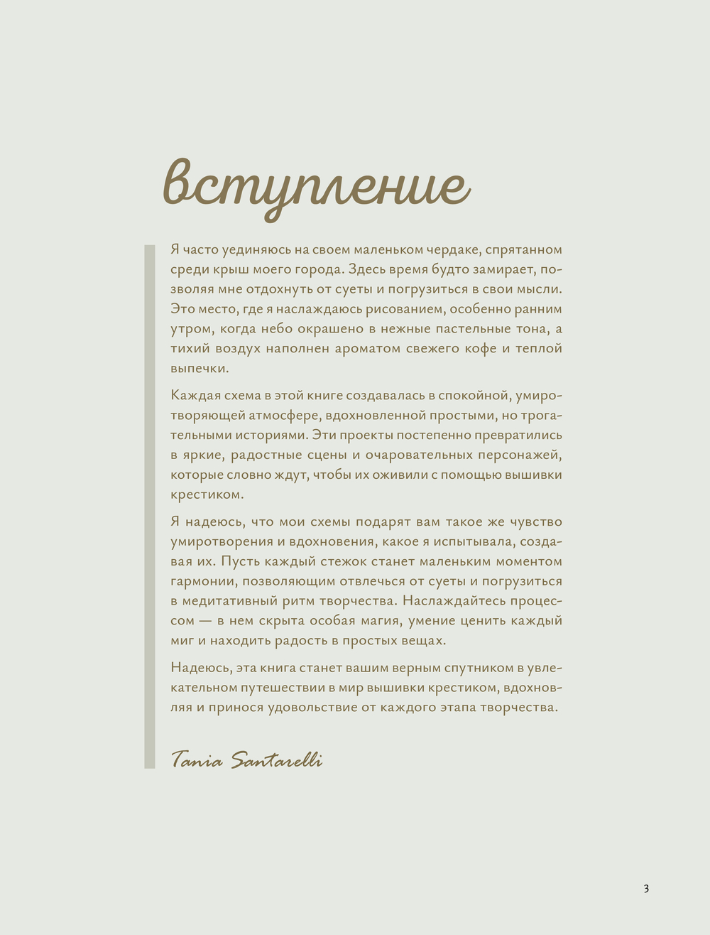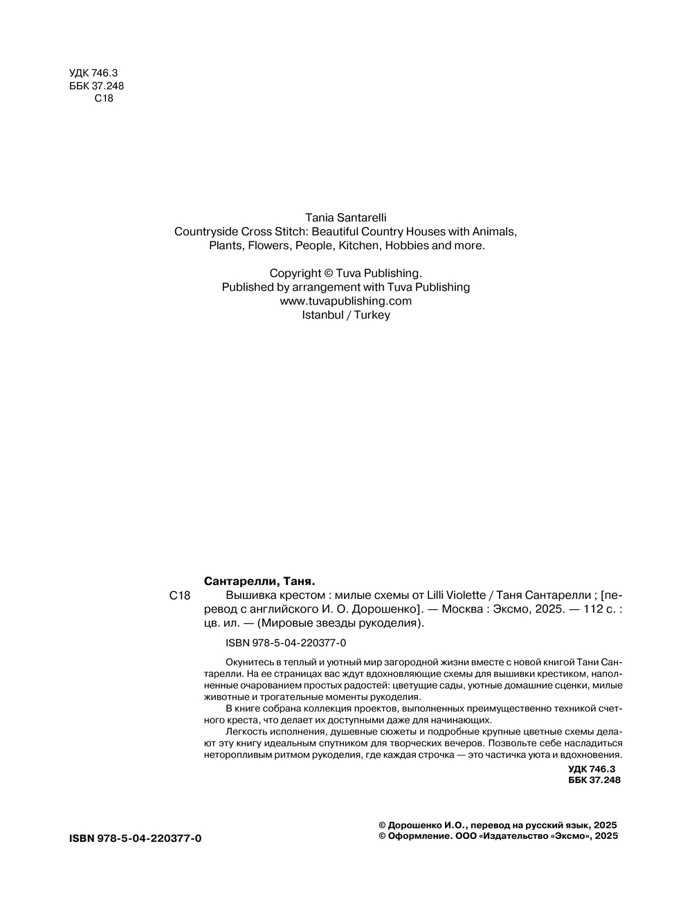 Окунитесь в теплый и уютный мир загородной жизни вместе с новой книгой Тани Сантарелли. На ее страницах вас ждут вдохновляющие схемы для вышивки крестиком, наполненные очарованием простых радостей: цветущие сады, уютные домашние сценки, милые животные и трогательные моменты рукоделия.