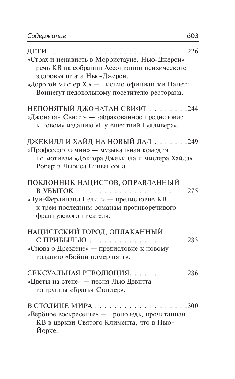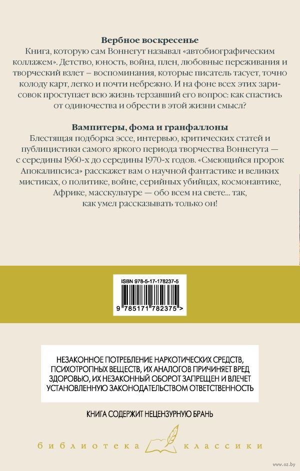 "Вампитеры, фома и гранфаллоны". Блестящая подборка эссе, интервью, критических статей и публицистики самого яркого периода творчества Воннегута – с середины 1960-х до середины 1970-х годов. "Смеющийся пророк Апокалипсиса" расскажет вам о научной фантастике и великих мистиках, о политике, войне, серийных убийцах, космонавтике, Африке, масскультуре – обо всем на свете… так, как умел рассказывать только он!