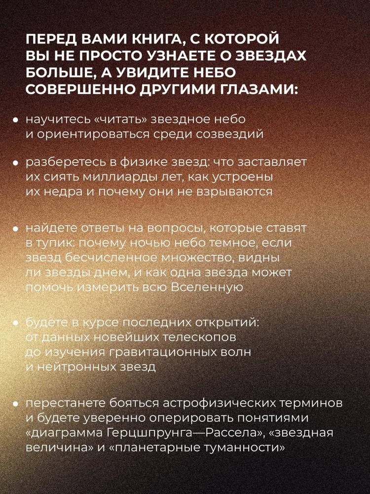 Эта книга содержит обзор современных представлений о звёздах. Рассказано о названиях созвездий и именах звёзд, о возможности их наблюдения ночью и днём, об основных характеристиках звёзд и их классификации. Основное внимание уделено природе звёзд: их внутреннему строению, источникам энергии, происхождению и эволюции. Обсуждаются поздние стадии звёздной эволюции, приводящие к формированию планетарных туманностей, белых карликов, нейтронных звёзд, а также к вспышкам новых и сверхновых.