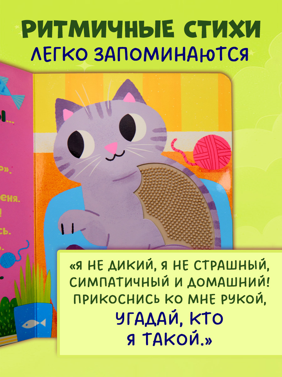 Тактильная книга для малышей "Кто я? Питомцы" познакомит детей с животными. Веселые стихи-загадки книги для детей – отличный досуг и развитие.