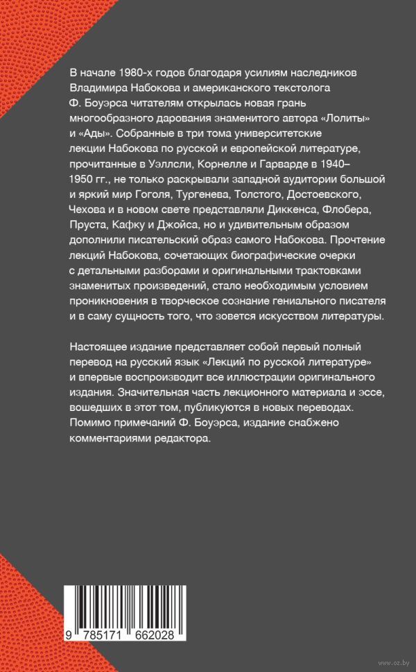 Настоящее издание представляет собой первый полный перевод на русский язык "Лекций по русской литературе" и впервые воспроизводит все иллюстрации оригинального издания. Значительная часть лекционного материала и эссе, вошедших в этот том, публикуются в новых переводах. Помимо примечаний Ф. Боуэрса, издание снабжено комментариями редактора.
