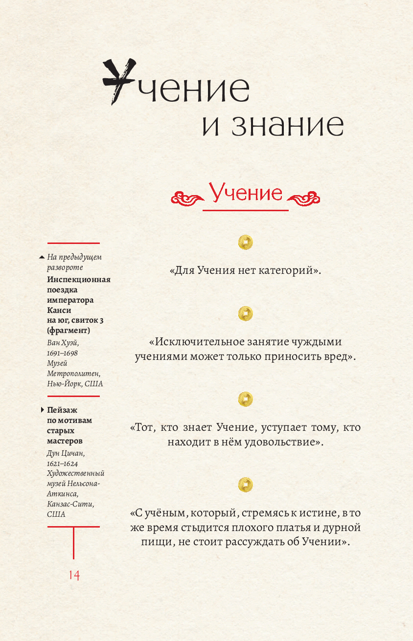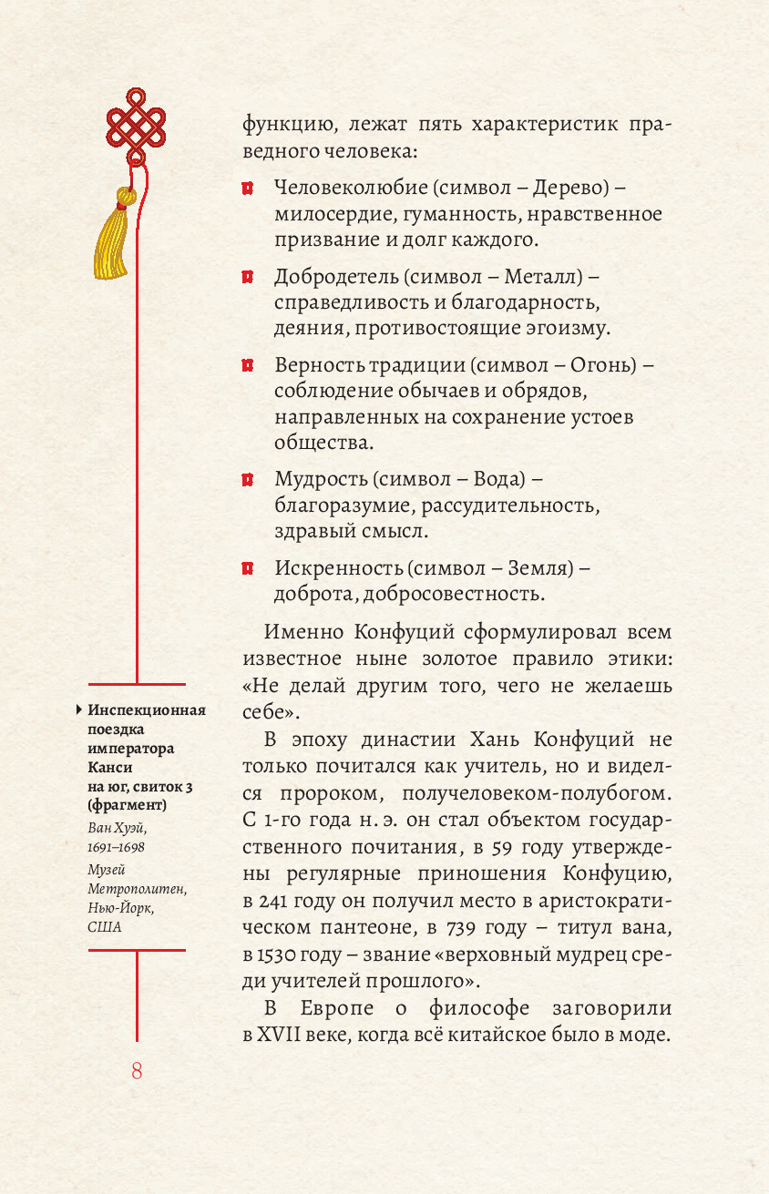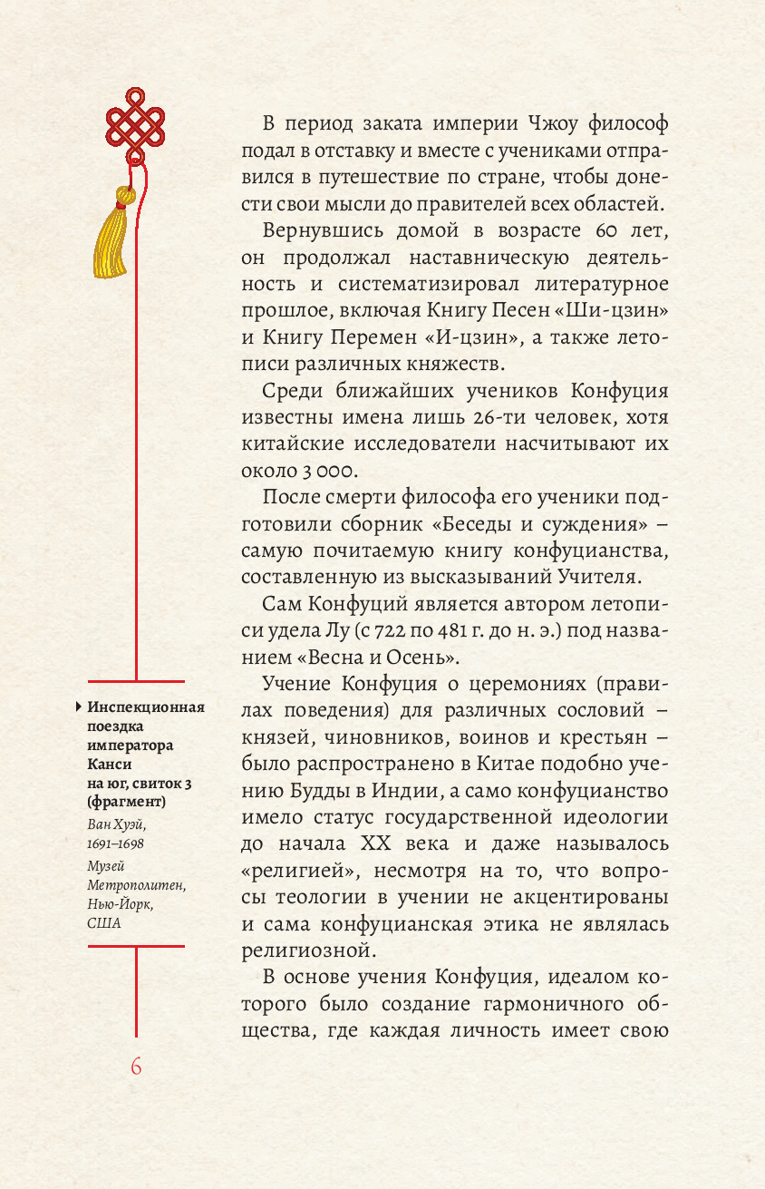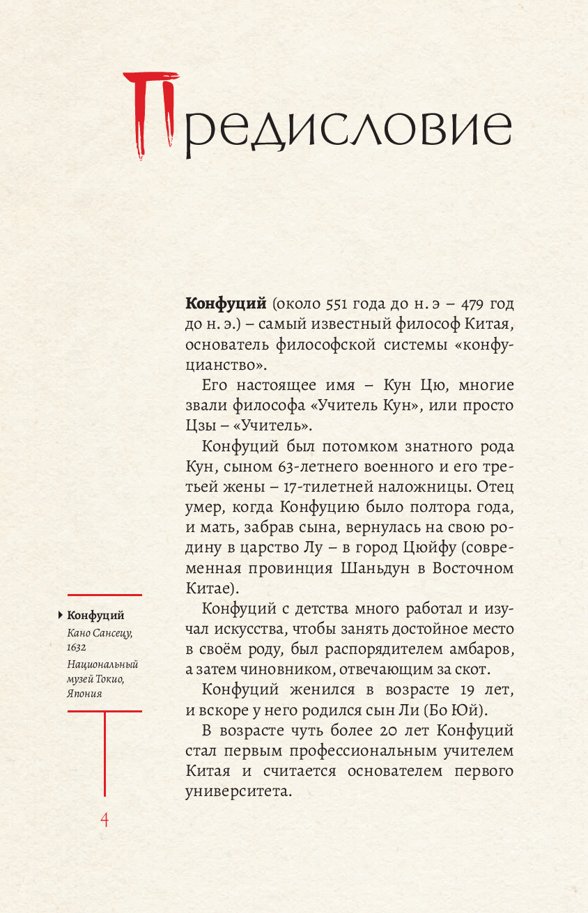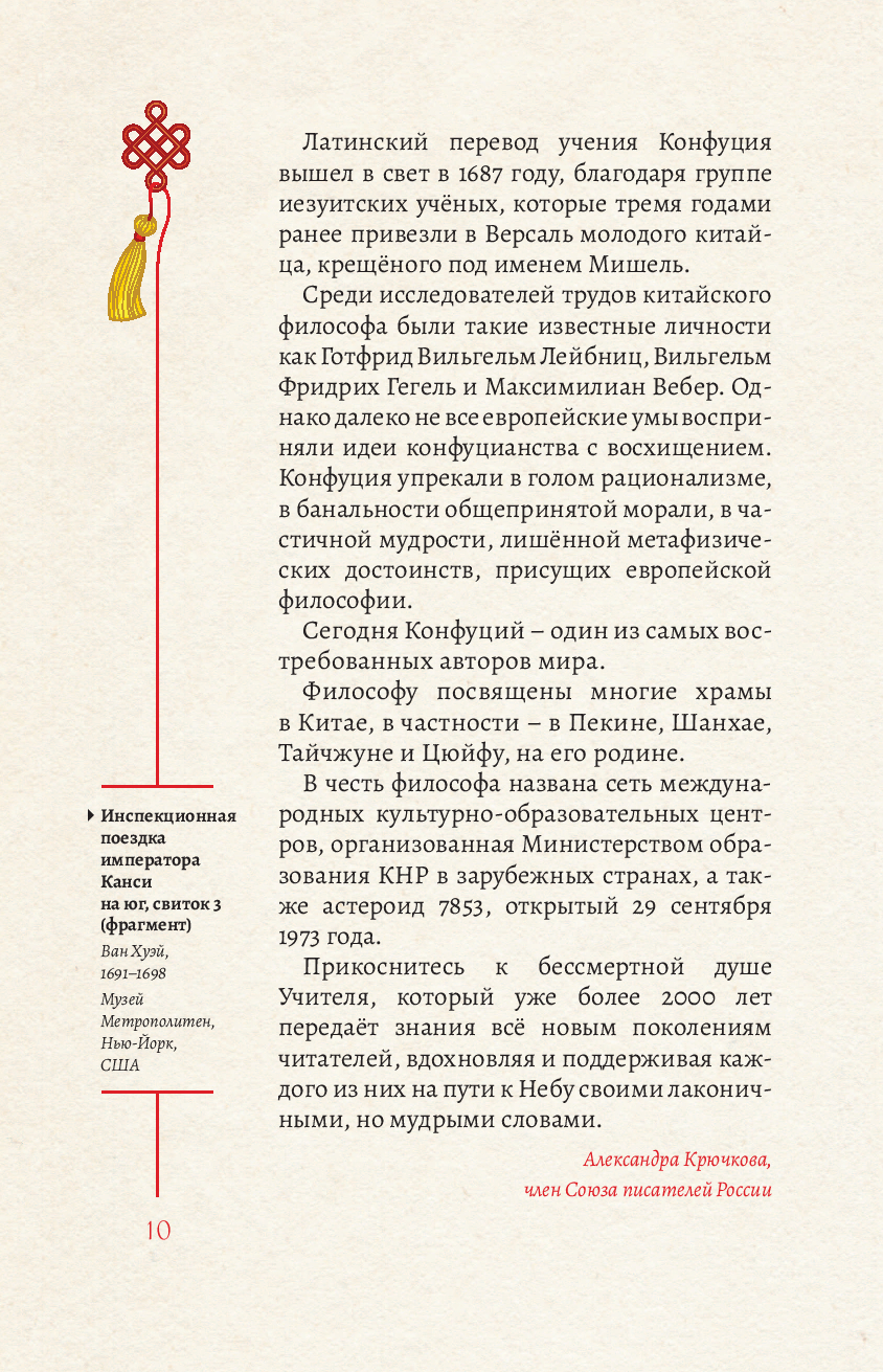 Учение Конфуция, основанное на человеколюбии, добродетели, верности традициям, мудрости и искренности, было распространено в Китае подобно учению Будды в Индии, а само конфуцианство имело статус государственной идеологии до начала XX века и даже называлось религией. В этом подарочном издании представлено 333 философских изречения Конфуция из самой почитаемой книги конфуцианства – "Беседы и суждения", в профессиональном переводе П. С. Попова (1842–1913), а также воспоминания о Конфуции его учеников. Жемчужины мудрости Востока гармонично дополняют 130 классических китайских гравюр. Прикоснитесь к бессмертной душе Учителя, который уже более 2000 лет передаёт знания всё новым поколениям читателей, вдохновляя и поддерживая каждого из них на пути к Небу своими лаконичными, но мудрыми словами.
