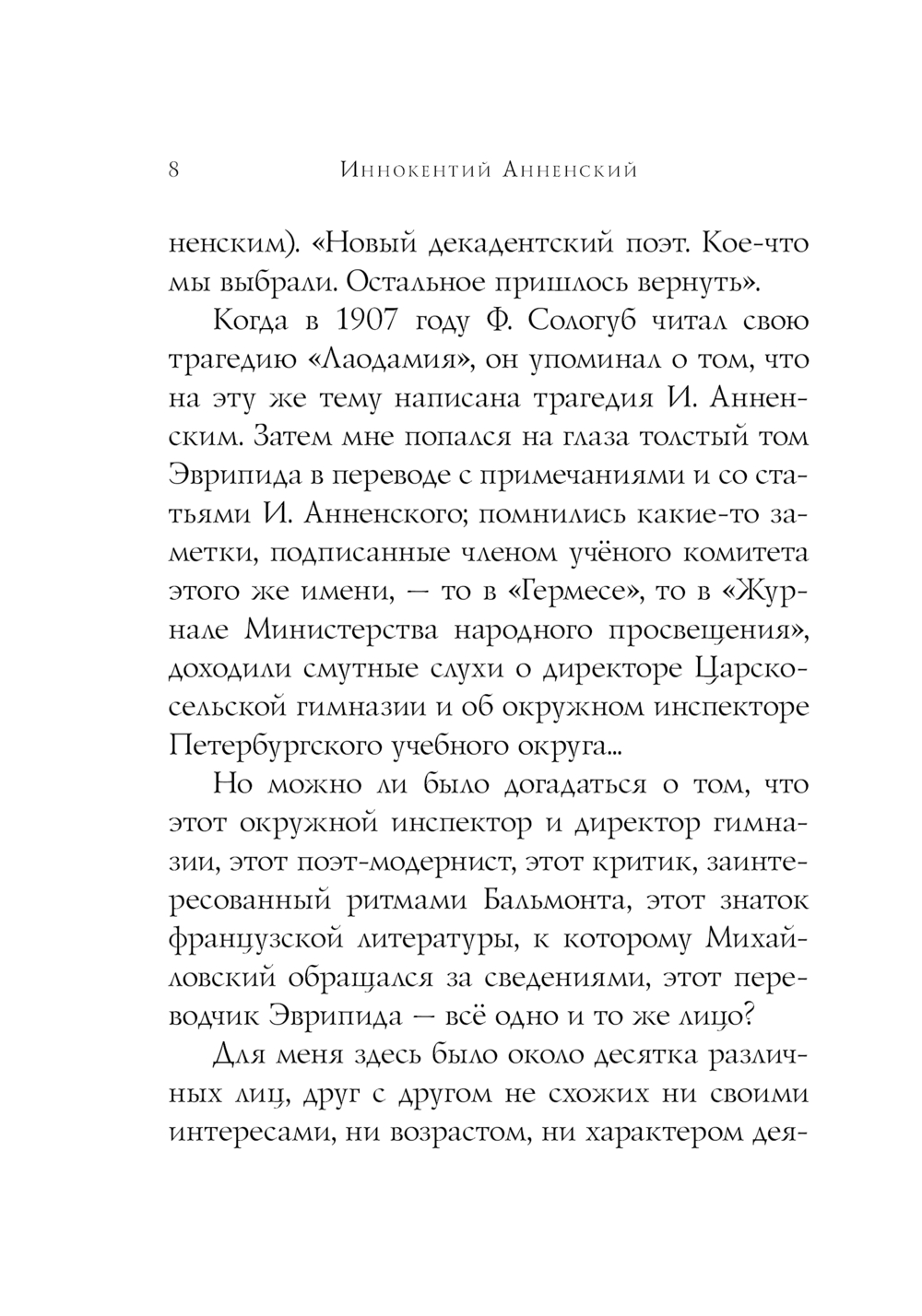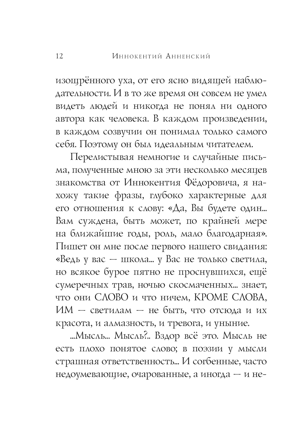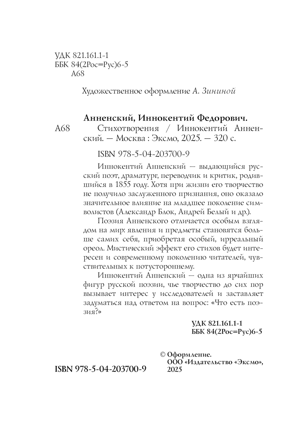 Поэзия Анненского отличается особым взглядом на мир: явления и предметы становятся больше самих себя, приобретая особый ирреальный ореол. Мистический эффект его стихов будет интересен и современному поколению читателей, чувствительных к потустороннему.