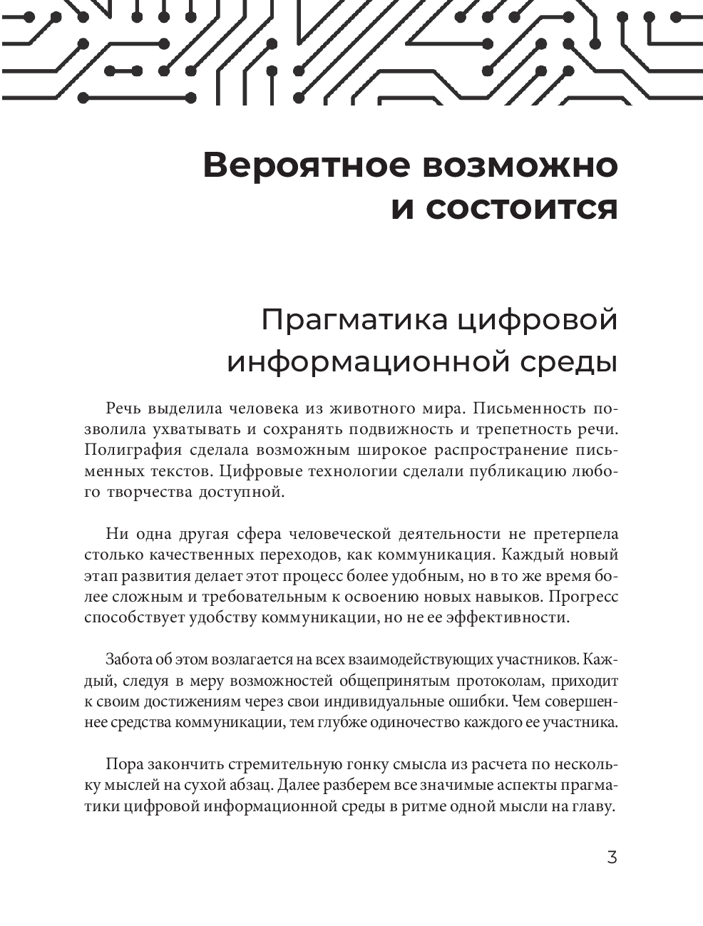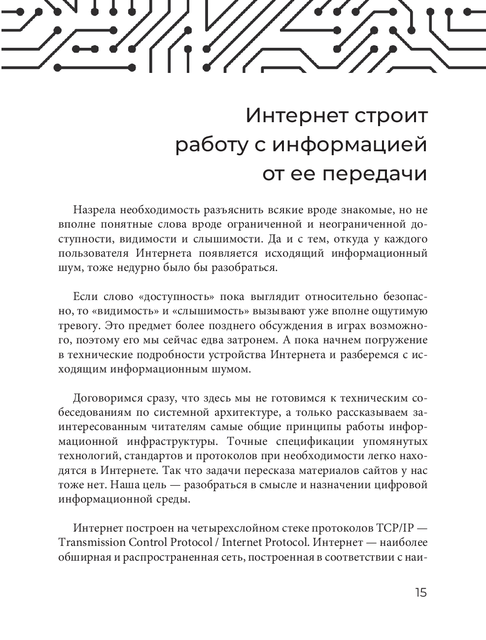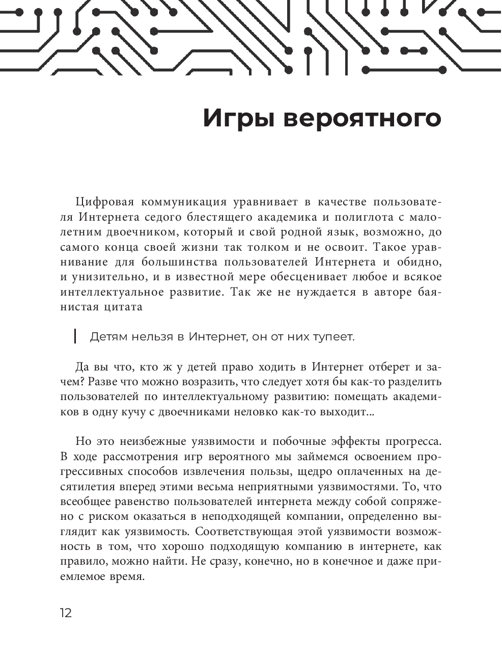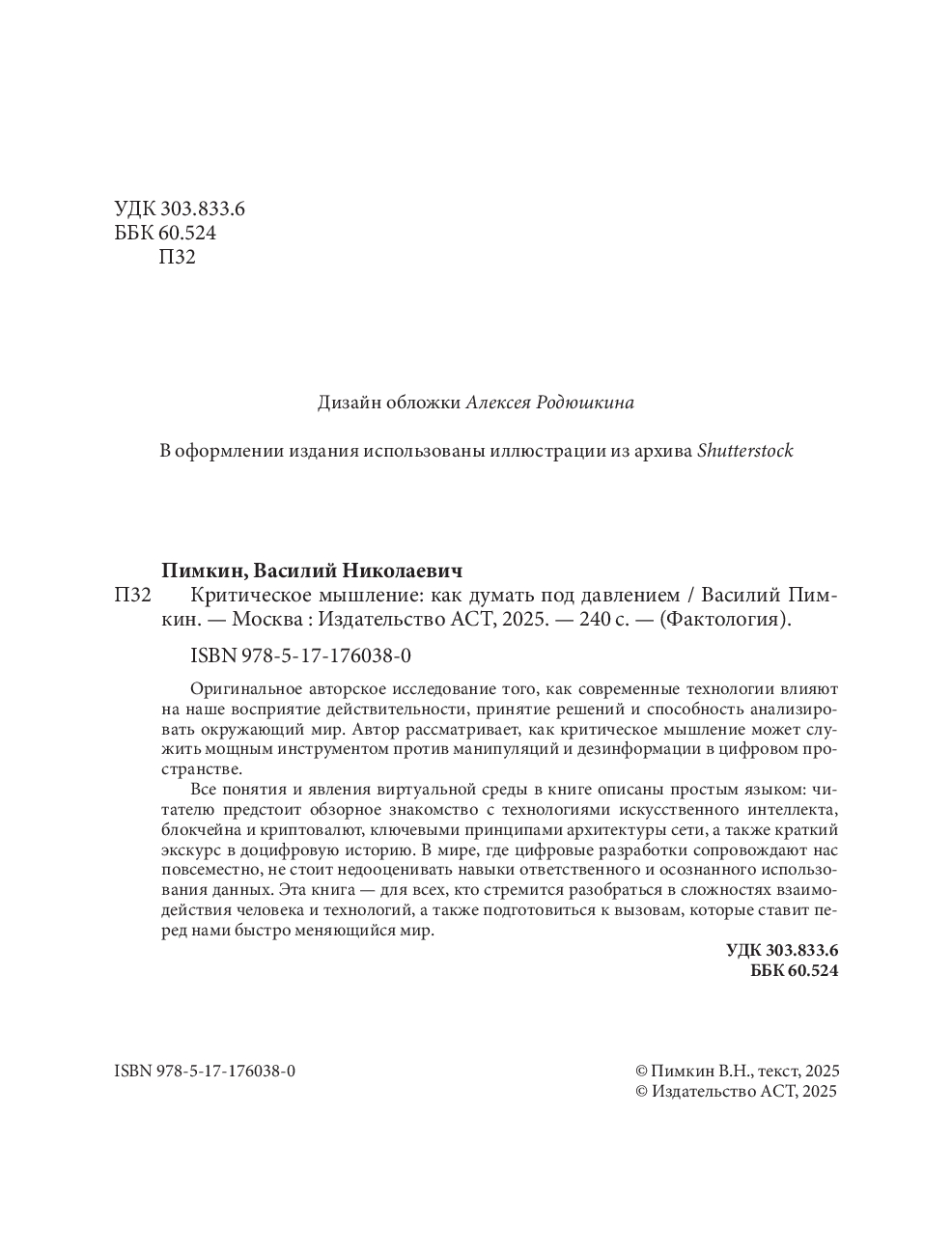 Оригинальное авторское исследование того, как современные технологии влияют на наше восприятие действительности, принятие решений и способность анализировать окружающий мир. Автор рассматривает, как критическое мышление может служить мощным инструментом против манипуляций и дезинформации в цифровом пространстве. Все понятия и явления виртуальной среды в книге описаны простым языком: читателю предстоит обзорное знакомство с технологиями искусственного интеллекта, блокчейна и криптовалют, ключевыми принципами архитектуры сети, а также краткий экскурс в доцифровую историю. В мире, где цифровые разработки сопровождают нас повсеместно, не стоит недооценивать навыки ответственного и осознанного использования данных.