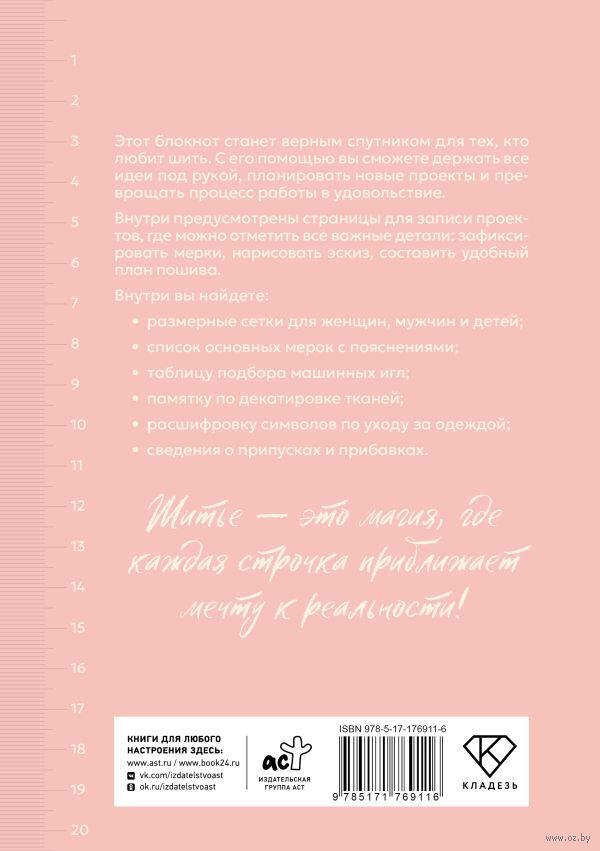 Также внутри вы найдете: размерные сетки для женщин, мужчин и детей; список основных мерок с пояснениями; таблицу подбора машинных игл; памятку по декатировке тканей; расшифровку символов по уходу за одеждой; сведения о припусках и прибавках.