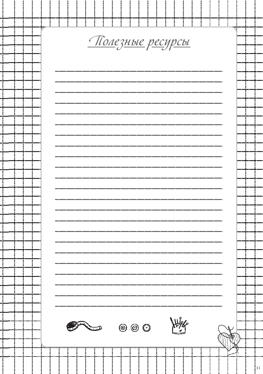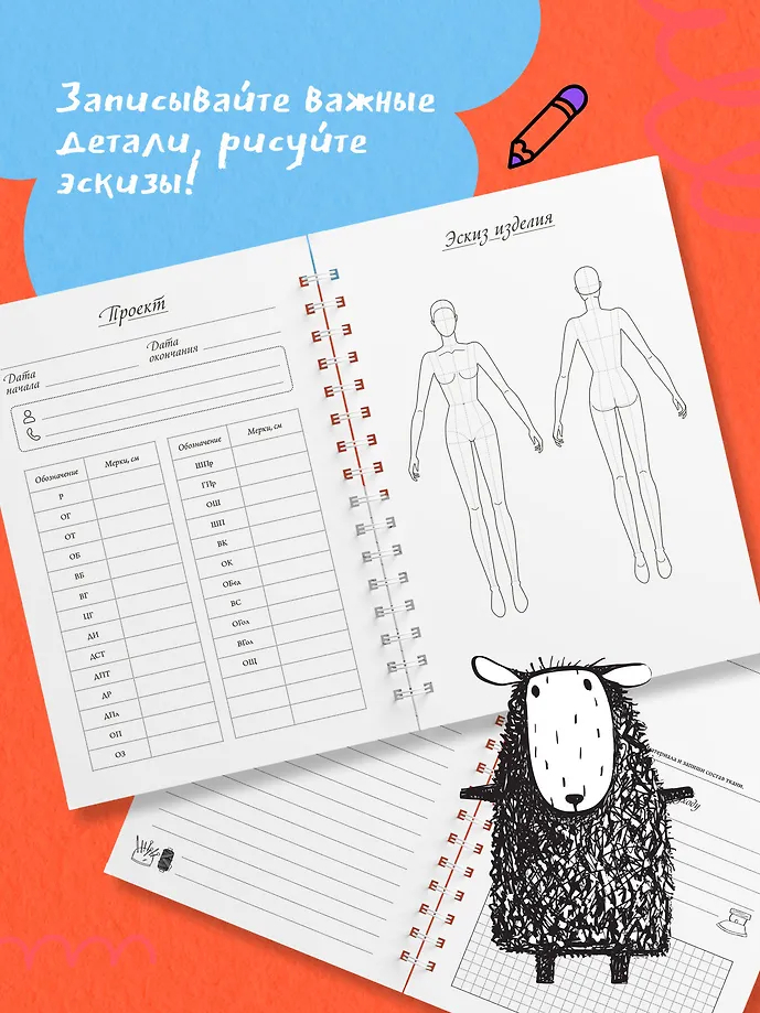 В блокноте предусмотрены специальные страницы для записи проектов, где можно зафиксировать все важные детали: записать мерки, нарисовать эскиз, составить удобный план пошива.