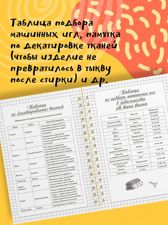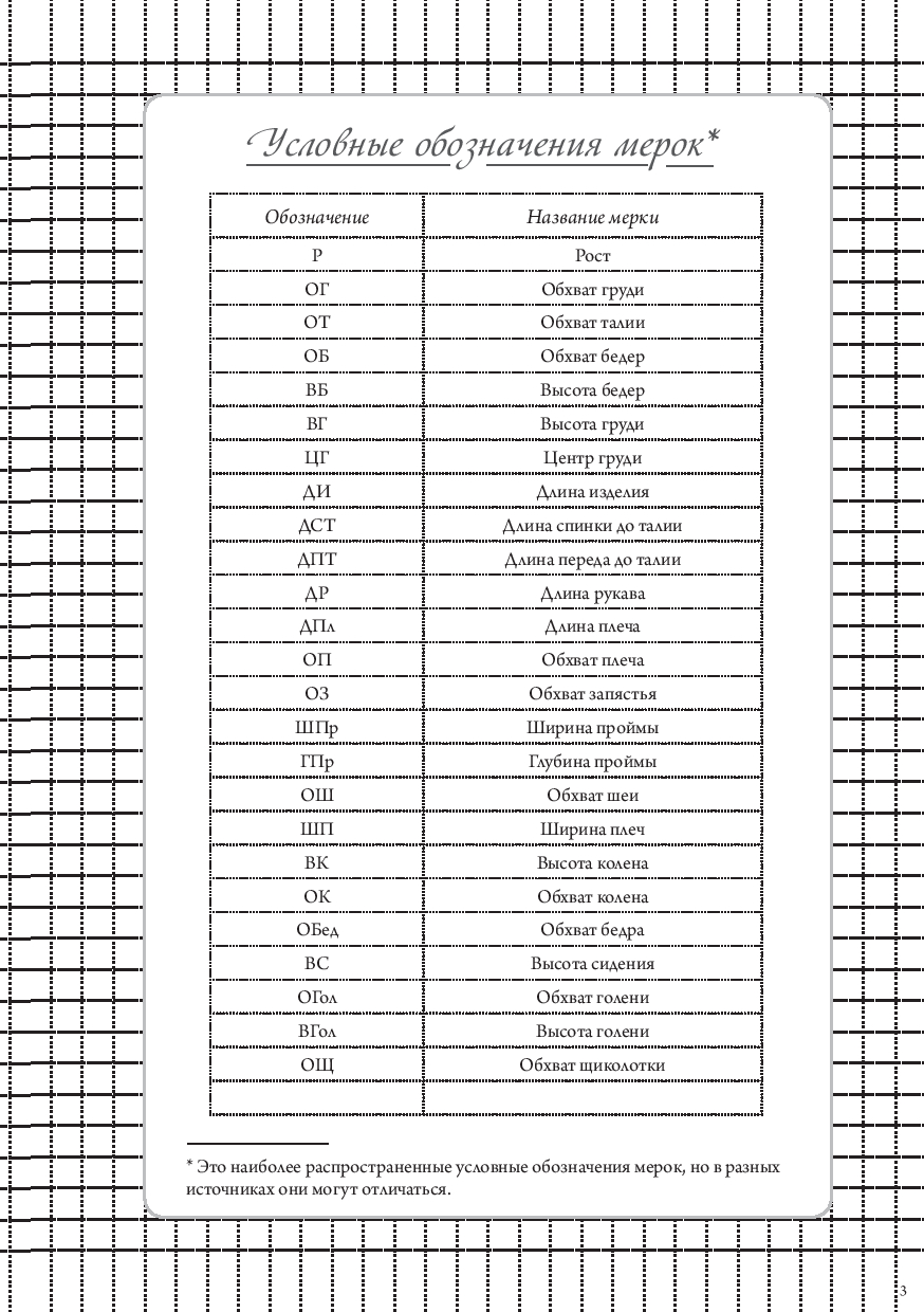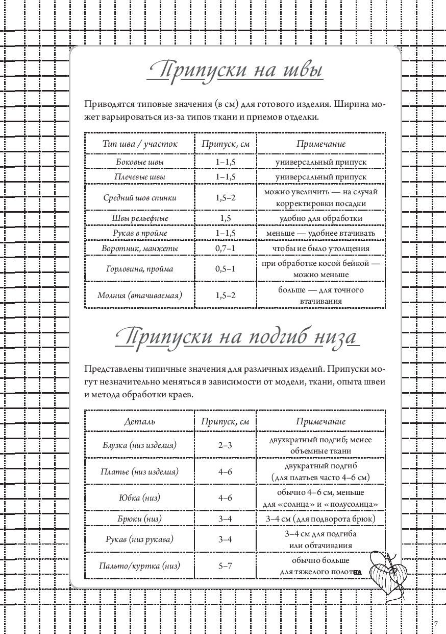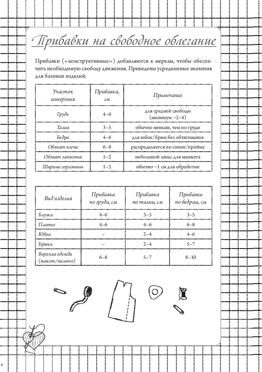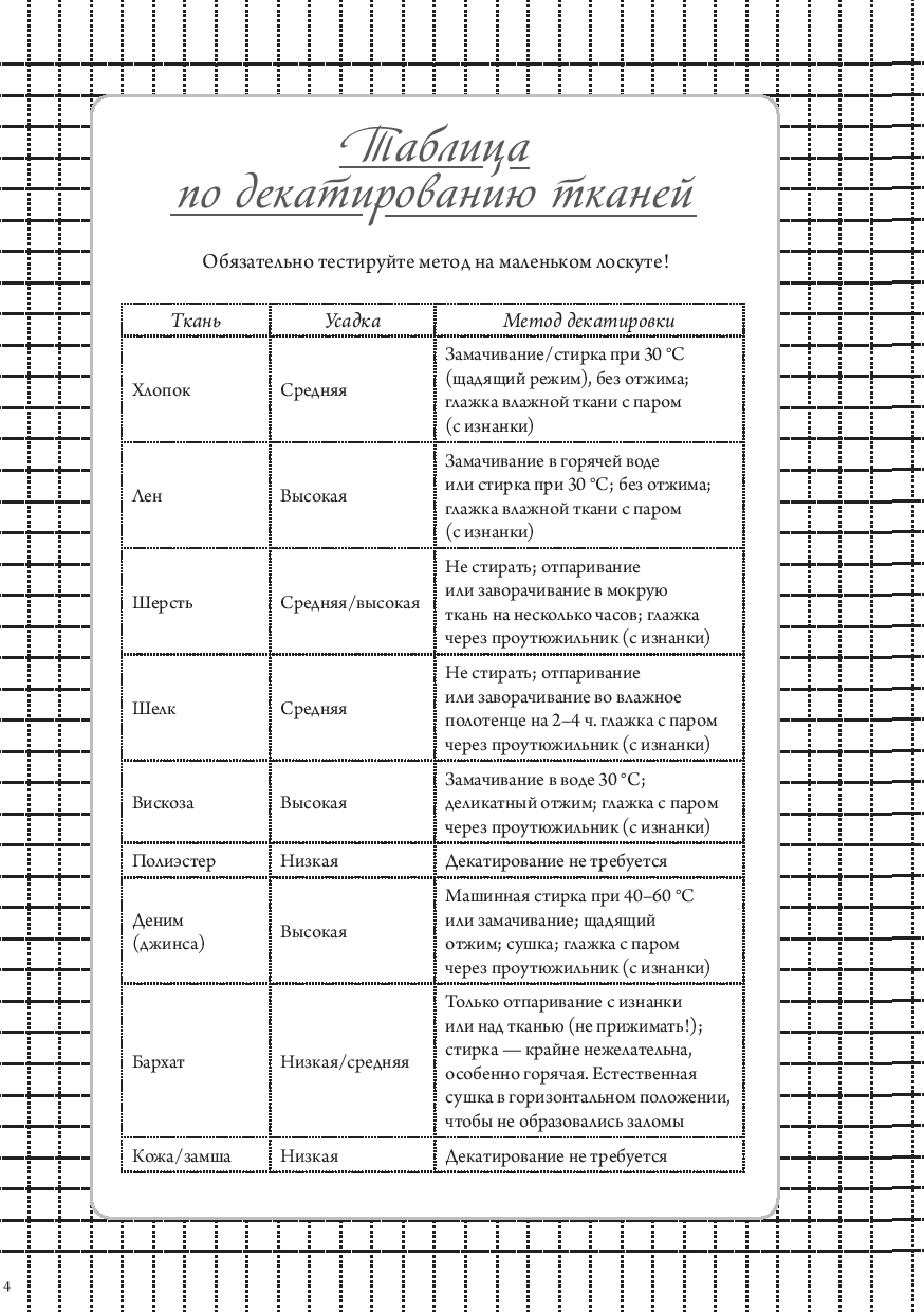 Также внутри вы найдете: размерные сетки для женщин, мужчин и детей; список основных мерок с пояснениями; таблицу подбора машинных игл; памятку по декатировке тканей; расшифровку символов по уходу за одеждой; сведения о припусках и прибавках.