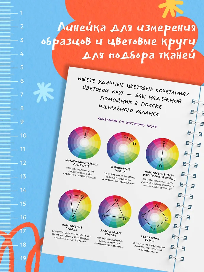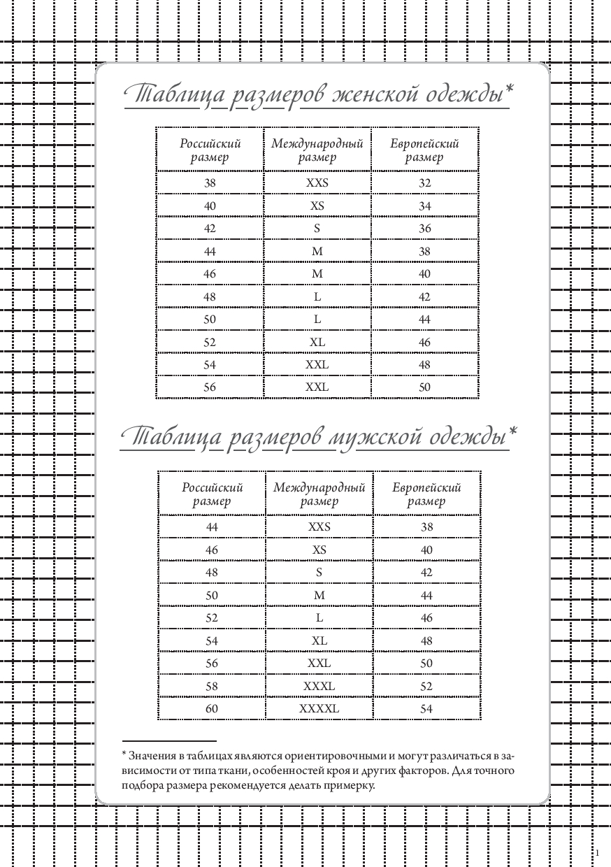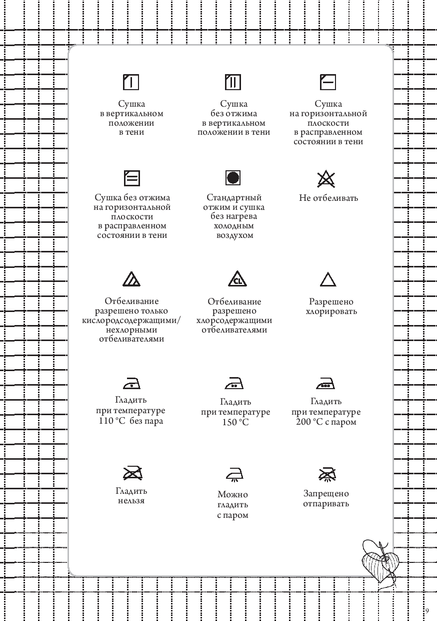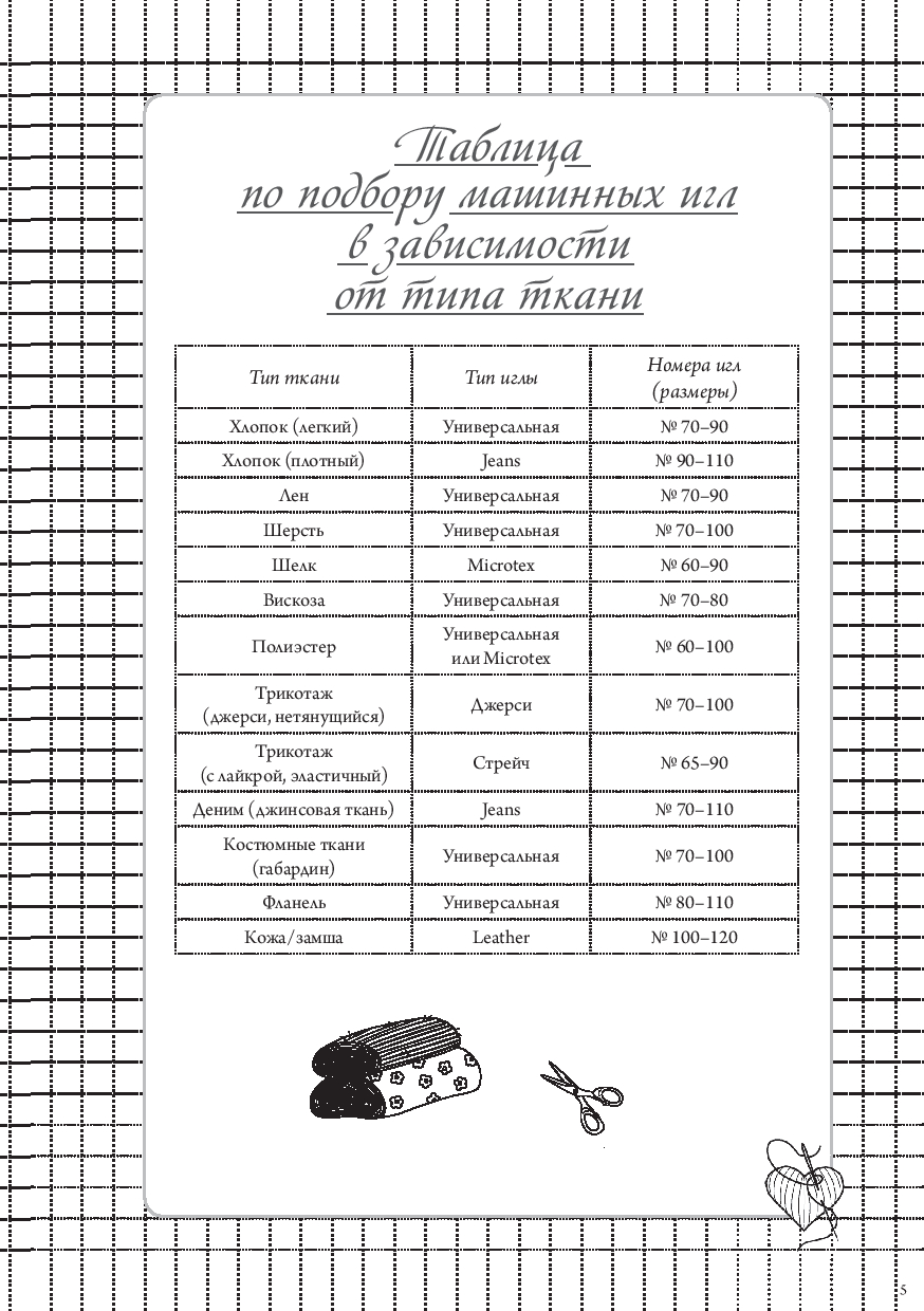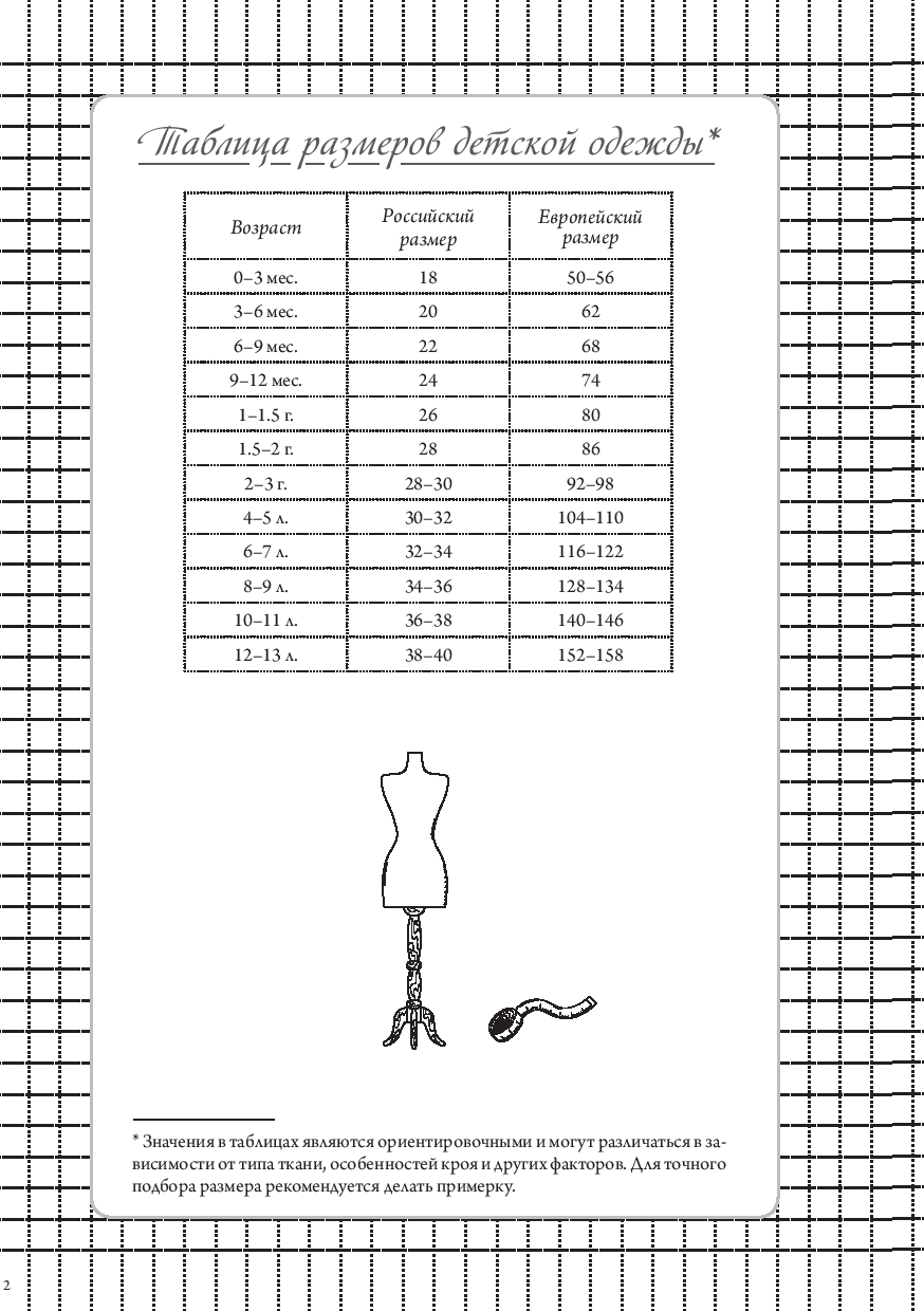 Также внутри вы найдете: размерные сетки для женщин, мужчин и детей; список основных мерок с пояснениями; таблицу подбора машинных игл; памятку по декатировке тканей; расшифровку символов по уходу за одеждой; сведения о припусках и прибавках.