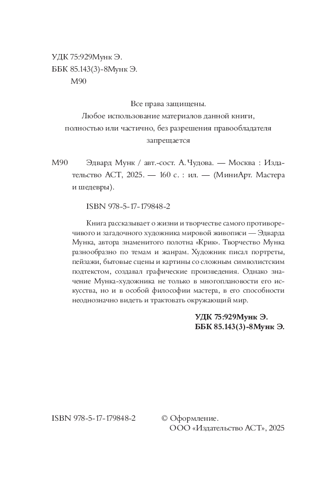 Книга рассказывает о жизни и творчестве самого противоречивого и загадочного художника мировой живописи – Эдварда Мунка, автора знаменитого полотна "Крик". Творчество Мунка разнообразно по темам и жанрам. Художник писал портреты, пейзажи, бытовые сцены и картины со сложным символистским подтекстом, создавал графические произведения. Однако значение Мунка-художника не только в многоплановости его искусства, а в и особой философии мастера, в его способности неоднозначно видеть и трактовать окружающий мир.
