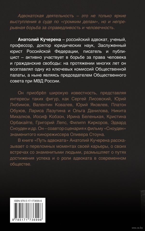 В книге "Путь адвоката" Анатолий Кучерена рассказывает о переломных моментах своей карьеры, о своих встречах со знаменитыми людьми, размышляет о путях достижения успеха и о роли адвоката в современном обществе.