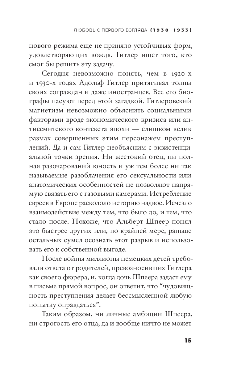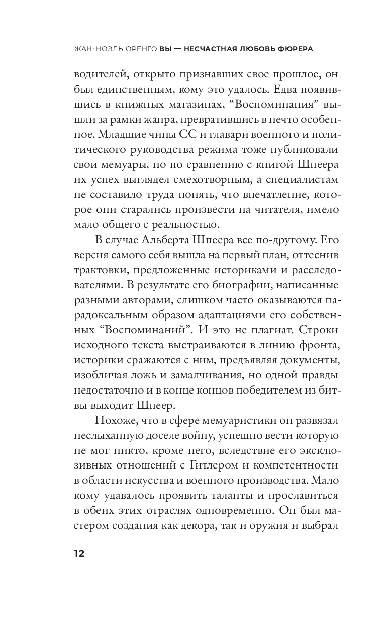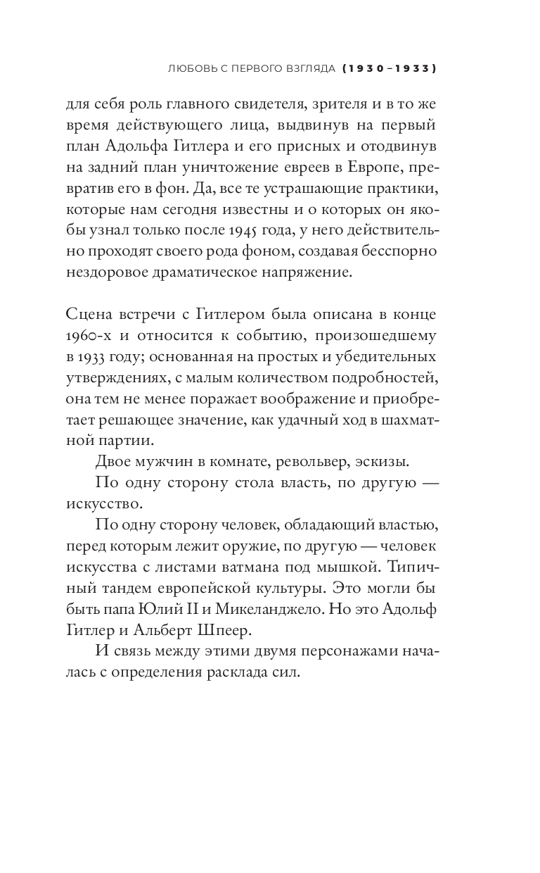 Эта книга – рассказ об одной из самых чудовищных фальсификаций в истории германского нацизма. Исследуя эпизоды из жизни Шпеера, договаривая за него там, где он предусмотрительно умолкает, привлекая свидетельства очевидцев, в том числе историка Гитты Серени, многократно встречавшейся со Шпеером, автор предлагает нам захватывающую повесть о человеке, которого один из его помощников когда‑то назвал “несчастной любовью фюрера”.