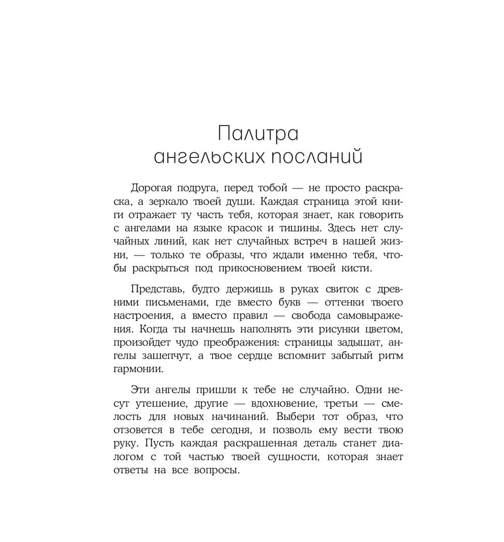 Раскрашивая их крылья и сияющие образы, ты наполнишь свои желания силой, а теплые слова-намерения помогут обратиться к ангельской помощи в самых разных ситуациях. Позволь краскам стать мостом между тобой и небесными проводниками – и почувствуй, как чудеса мягко вплетаются в твою реальность.