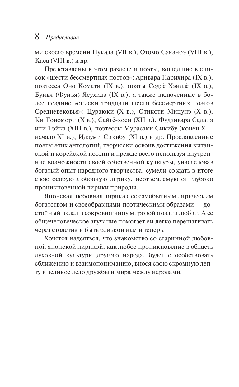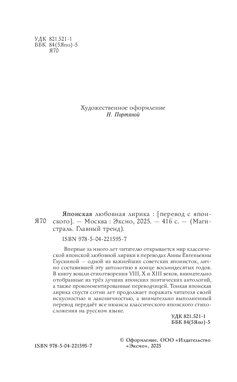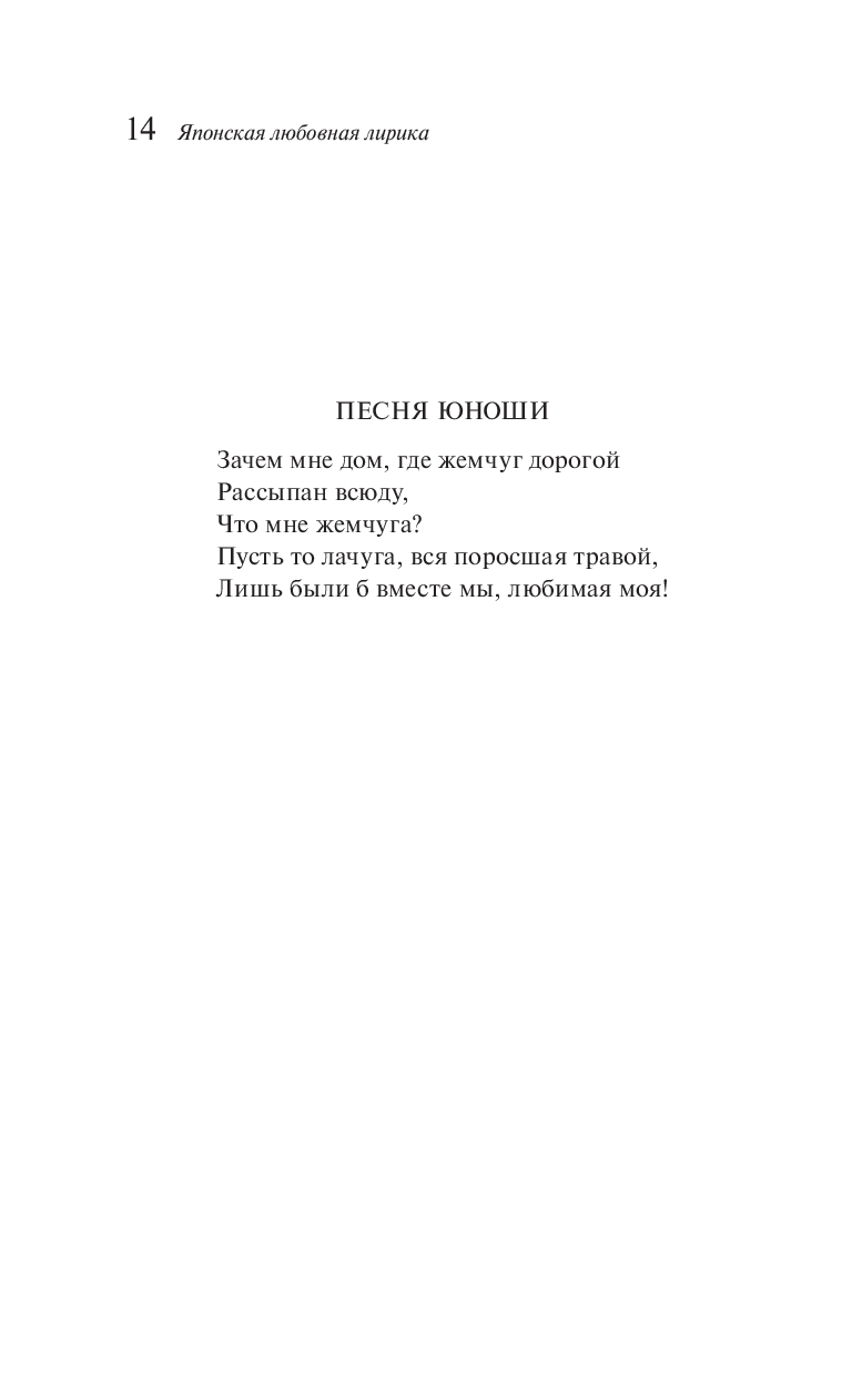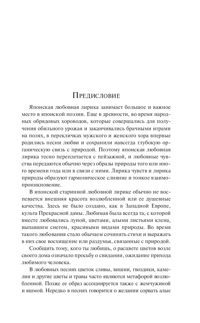 Впервые за много лет читателю открывается мир классической японской любовной лирики в переводах Анны Евгеньевны Глускиной – одной из важнейших советских японисток, лично составившей эту антологию в конце восьмидесятых годов. В книгу вошли стихотворения VIII, X и XIII веков, внимательно отобранные из трёх лучших японских поэтических антологий, а также прокомментированные переводчицей. Тонкая японская лирика спустя сотни лет продолжает поражать читателя своей искусностью и лаконичностью, а внимательно выполненный перевод передаёт все нюансы классического японского стихосложения на русском языке.