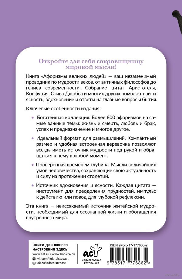Это уникальное собрание мудрости человечества, объединившее под одной обложкой проницательные афоризмы величайших мыслителей, философов, ученых и деятелей от глубокой древности до наших дней. Книга представляет собой масштабное путешествие сквозь эпохи: от бессмертных изречений Конфуция и Сократа до прозрений Леонардо да Винчи и Вольтера, и далее – к остроумным наблюдениям Марка Твена, гениальным прозрениям Альберта Эйнштейна, смелым идеям Стивена Хокинга и вдохновляющим мыслям Стива Джобса.