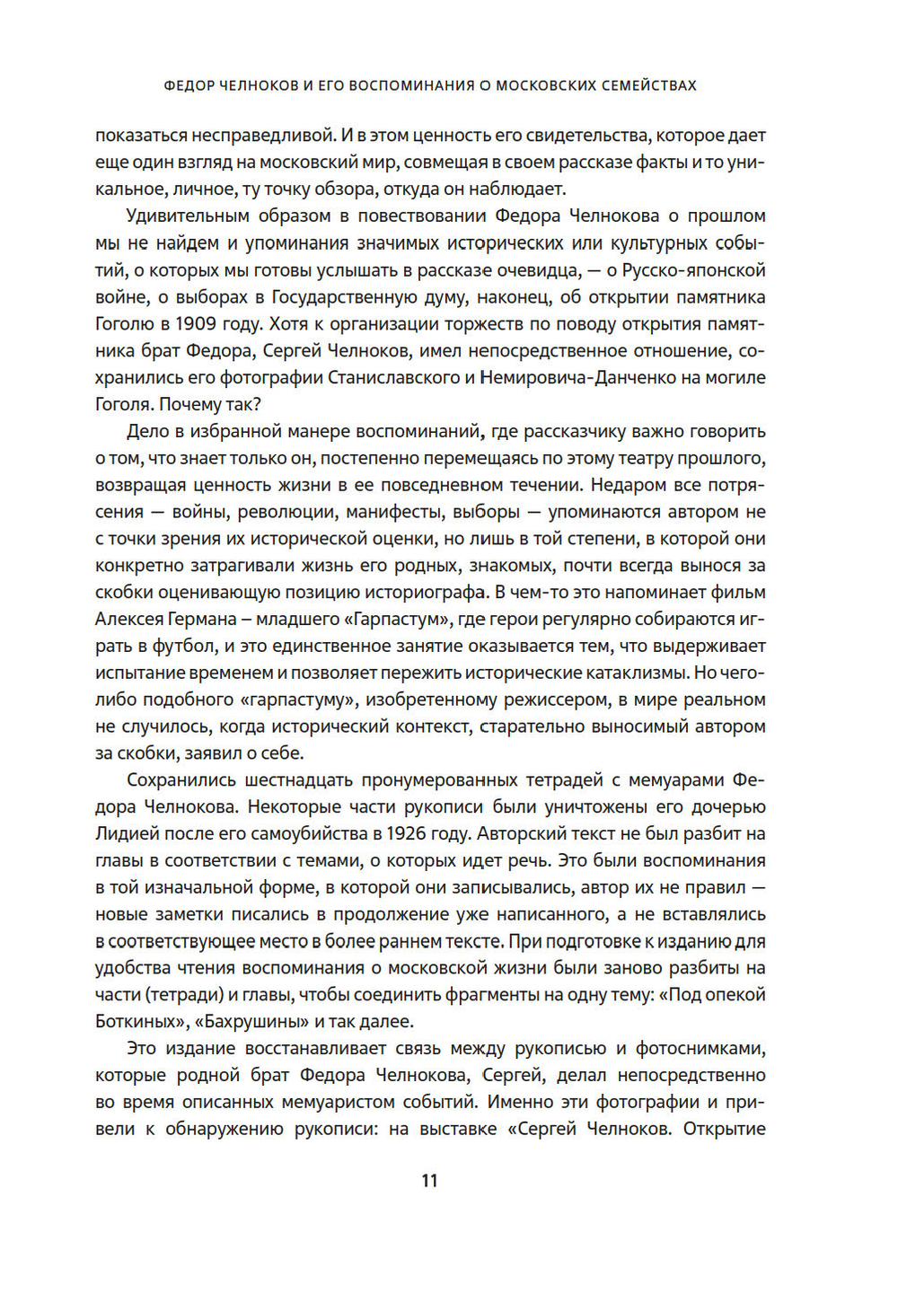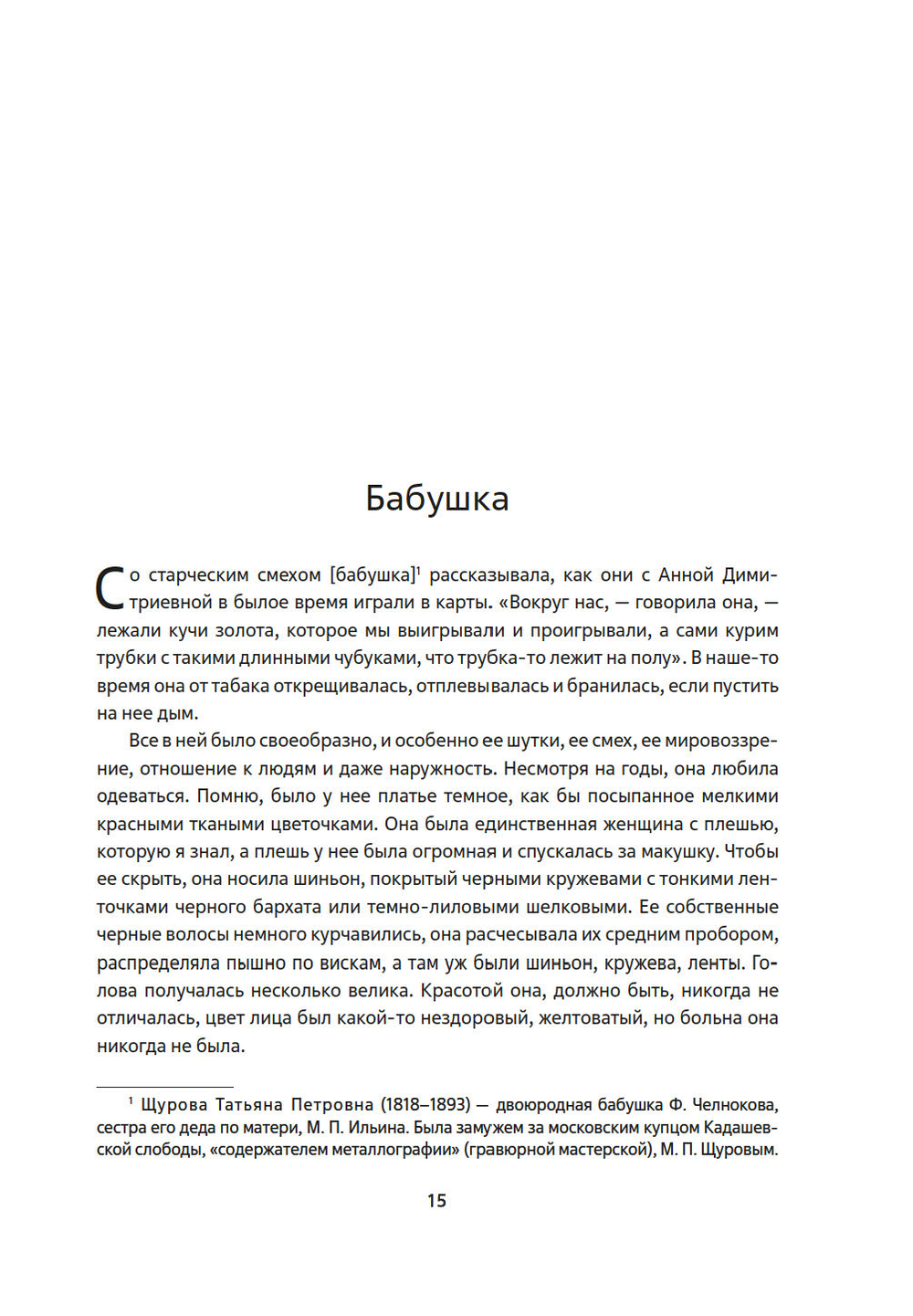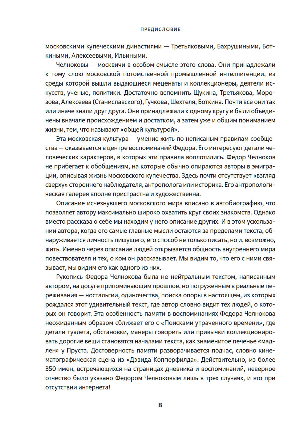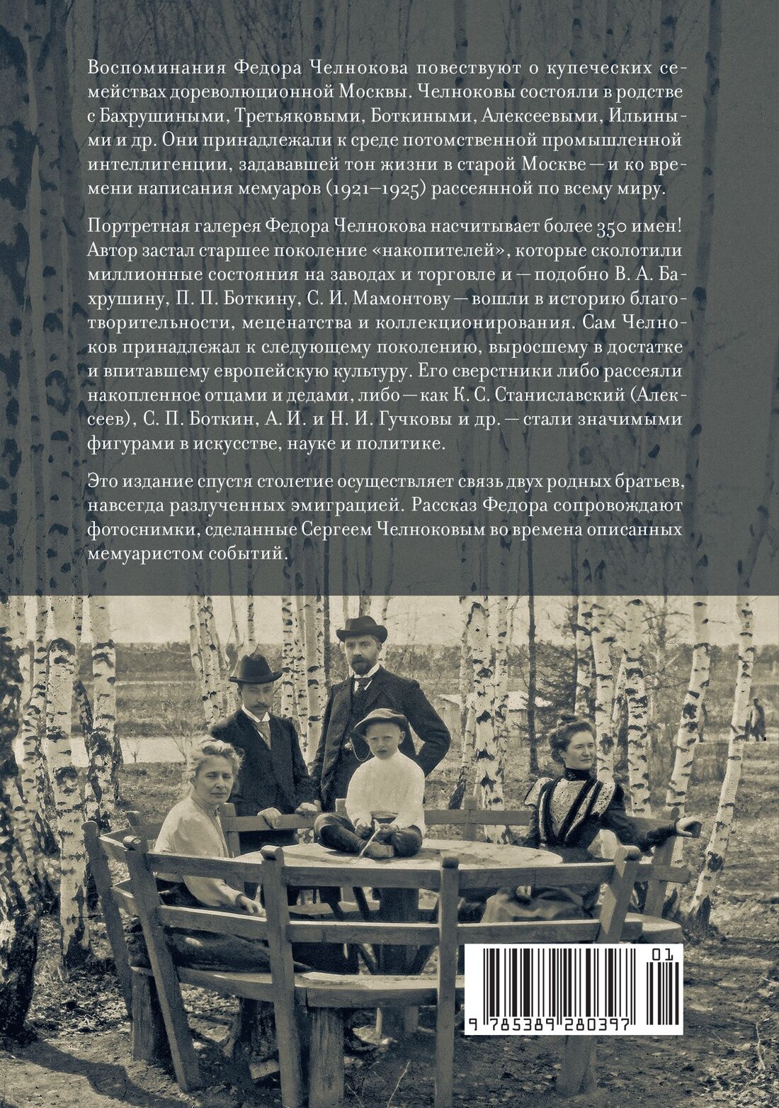 Воспоминания Федора Васильевича Челнокова (1866–1925) издаются впервые. Рукопись, написанная в Берлине в 1921–1925 гг., рассказывает о купеческих семействах старой Москвы, знакомых автору с рождения. Челноковы, Бахрушины, Третьяковы, Боткины, Алексеевы, Ильины – в поле внимания автора попадают более 350 имен из числа его родственников и друзей. Издание сопровождают фотографии, сделанные братом мемуариста, Сергеем Васильевичем Челноковым (1860–1924).