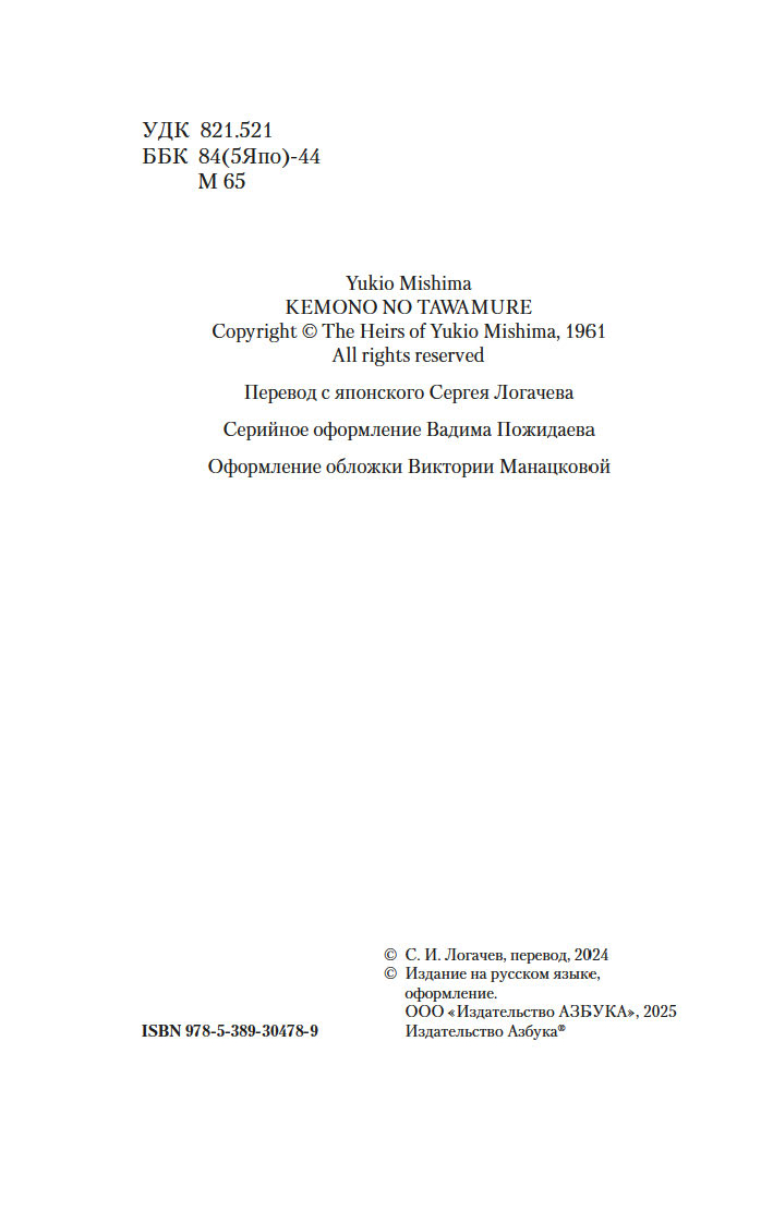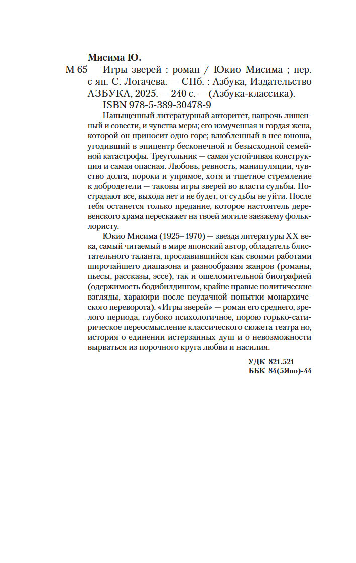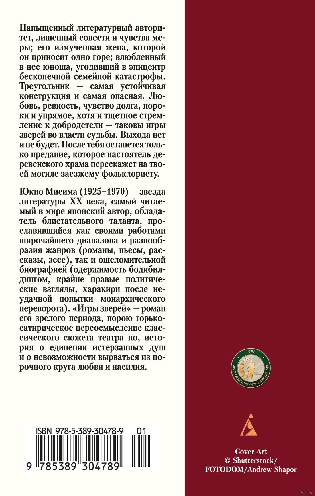 Юкио Мисима (1925-1970) – звезда литературы XX века, самый читаемый в мире японский автор, обладатель блистательного таланта, прославившийся как своими работами широчайшего диапазона и разнообразия жанров (романы, пьесы, рассказы, эссе), так и ошеломительной биографией (одержимость бодибилдингом, крайне правые политические взгляды, харакири после неудачной попытки монархического переворота). "Игры зверей" – роман его среднего, зрелого периода, глубоко психологичное, порою горько-сатирическое переосмысление классического сюжета театра но, история о единении истерзанных душ и о невозможности вырваться из порочного круга любви и насилия.