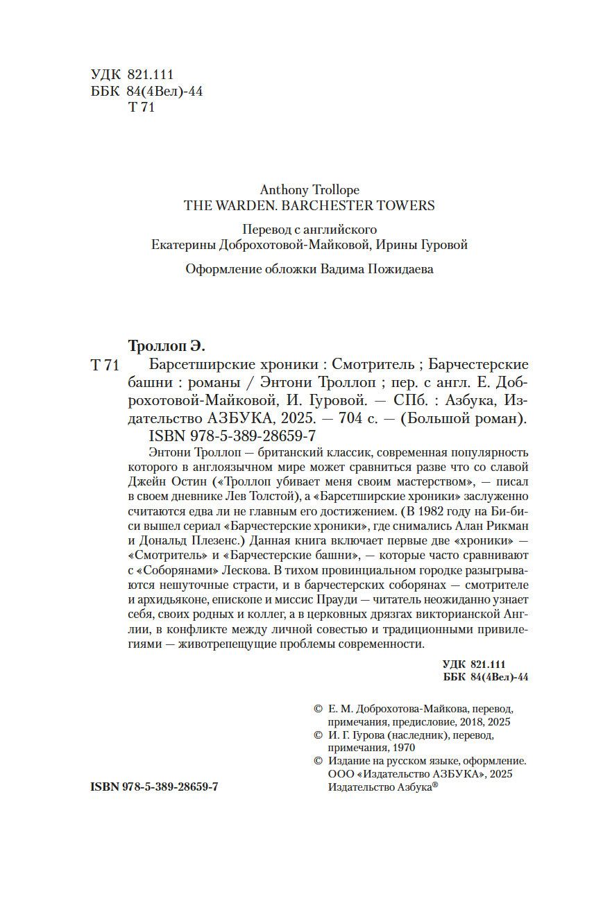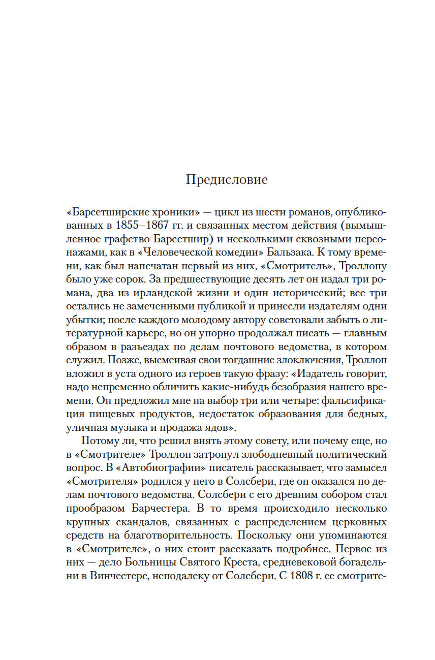 Энтони Троллоп – британский классик, современная популярность которого в англоязычном мире может сравниться разве что со славой Джейн Остин ("Троллоп убивает меня своим мастерством", – писал в своем дневнике Лев Толстой), а "Барсетширские хроники" заслуженно считаются едва ли не главным его достижением. (В 1982 году на Би-би-си вышел сериал "Барчестерские хроники", где снимались Алан Рикман и Дональд Плезенс.) Данная книга включает первые две "хроники" – "Смотритель" и "Барчестерские башни", – которые часто сравнивают с "Соборянами" Лескова.