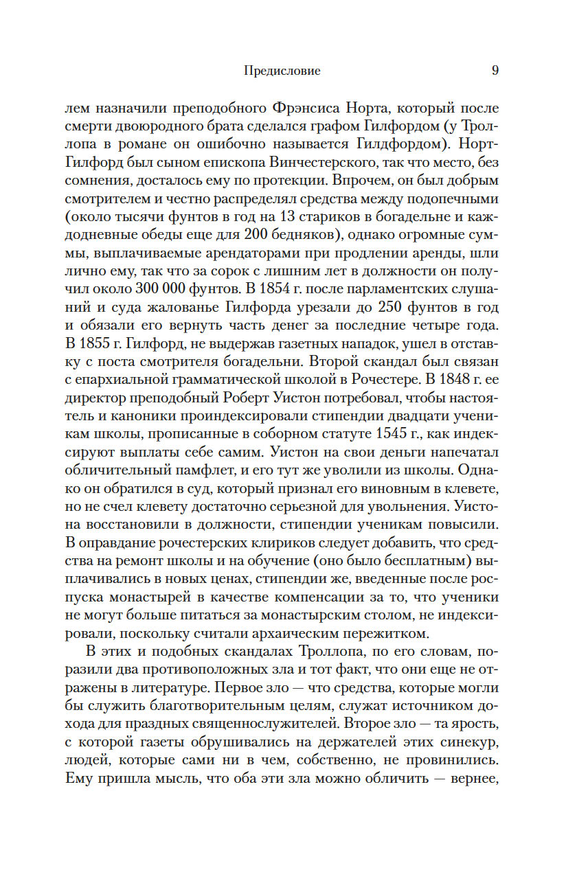 В тихом провинциальном городке разыгрываются нешуточные страсти, и в барчестерских соборянах – смотрителе и архидьяконе, епископе и миссис Прауди – читатель неожиданно узнает себя, своих родных и коллег, а в церковных дрязгах викторианской Англии, в конфликте между личной совестью и традиционными привилегиями – животрепещущие проблемы современности.