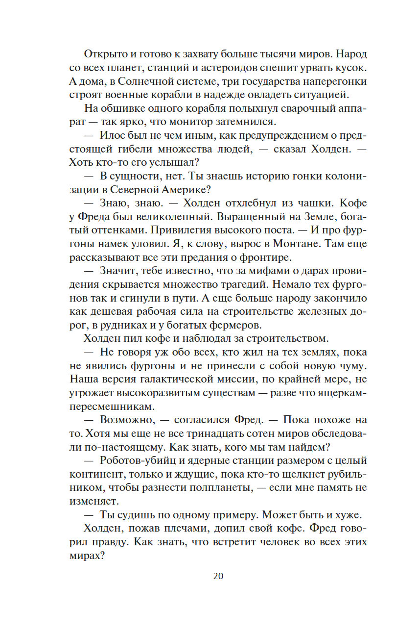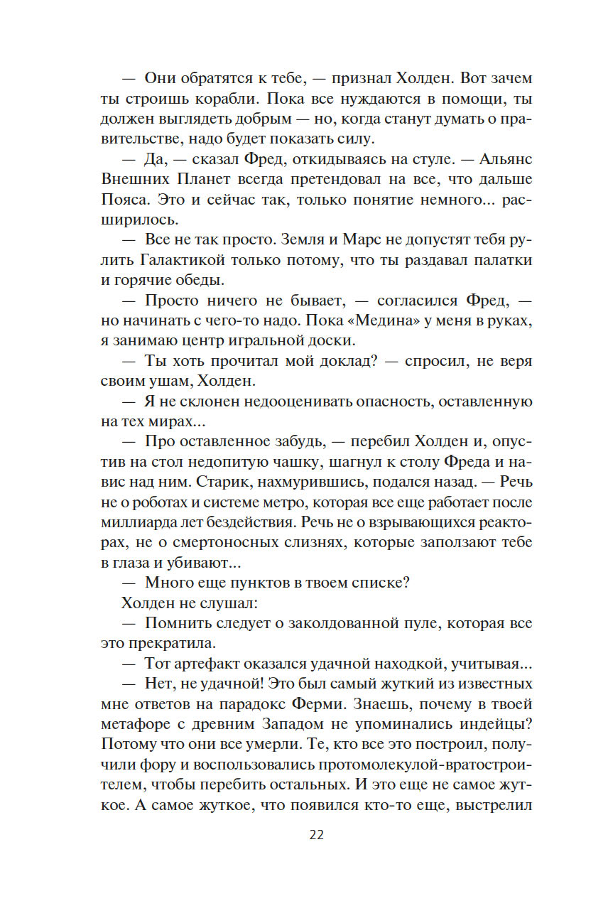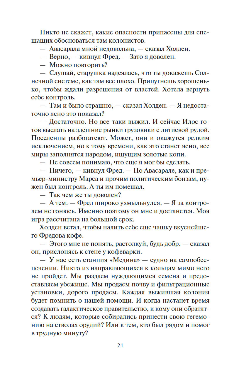 Бесследно исчезают корабли. Тайно формируются частные армии. Выкраден последний образец протомолекулы. Террористы своими акциями добиваются того, о чем прежде и мечтать не смели, – подчинения внутренних планет. Пришла расплата за старые грехи, и цена их чудовищна.