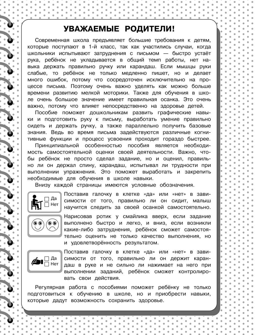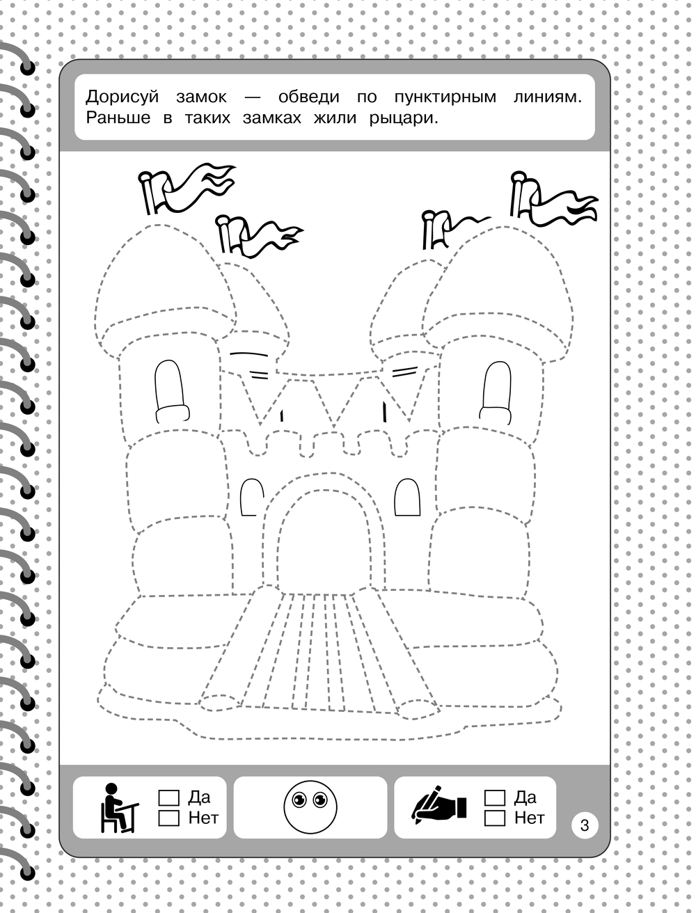 Кроме того, внизу каждой страницы имеются значки для оценки выполненных заданий. Поставив галочку в клетках "да" или "нет", малыш сможет проконтролировать себя, а нарисовав ротик у смайлика вверх или вниз – оценить результат (хорошо / не очень хорошо). Регулярная работа с пособием поможет ребёнку развить мелкую моторику.