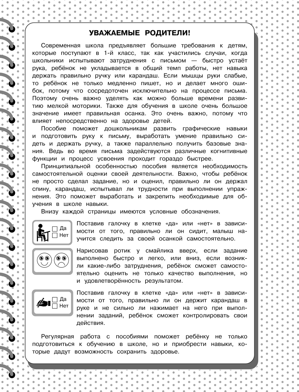 Цель пособия, соответствующего ФГОС, – помочь дошкольнику развить мелкую моторику и подготовить руку к письму. Выполняя интересные игровые задания, ребёнок будет проводить разные типы линий и штриховать, рисовать по точкам и клеткам, проходить запутанные лабиринты. Крупные занимательные картинки понравятся любому малышу, и он получит от своей деятельности огромное удовольствие.