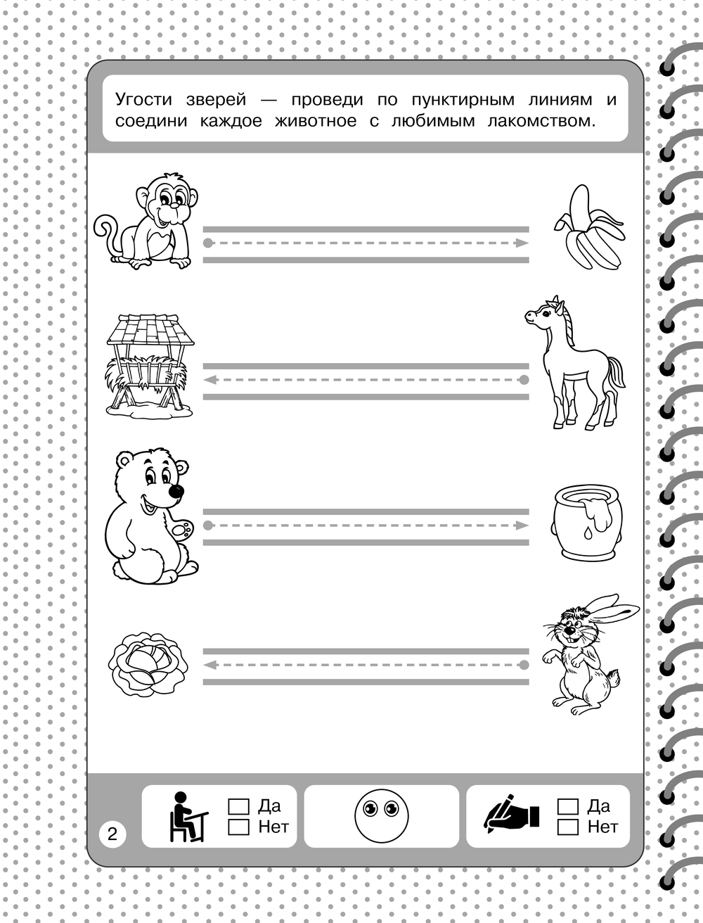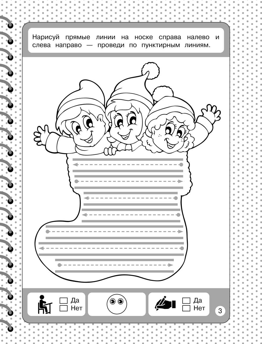 Кроме того, внизу каждой страницы имеются значки для оценки выполненных заданий. Поставив галочку в клетках "да" или "нет", малыш сможет проконтролировать себя, а нарисовав ротик у смайлика вверх или вниз – оценить результат (хорошо / не очень хорошо). Регулярная работа с пособием поможет ребёнку развить мелкую моторику.