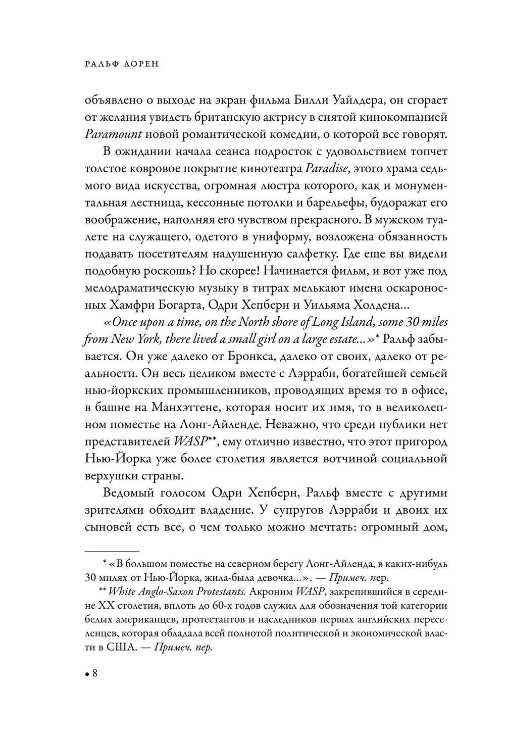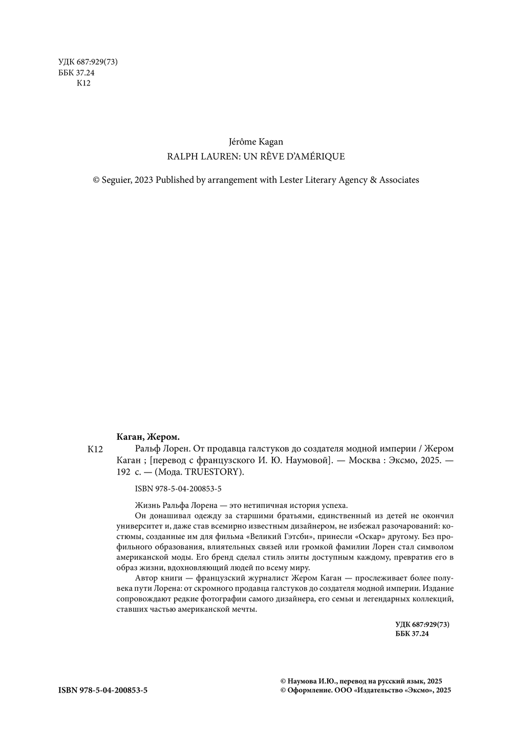 Автор книги – французский журналист Жером Каган – прослеживает более полувека пути Лорена: от скромного продавца галстуков до создателя модной империи. Издание сопровождают редкие фотографии самого дизайнера, его семьи и легендарных коллекций, ставших частью американской мечты.