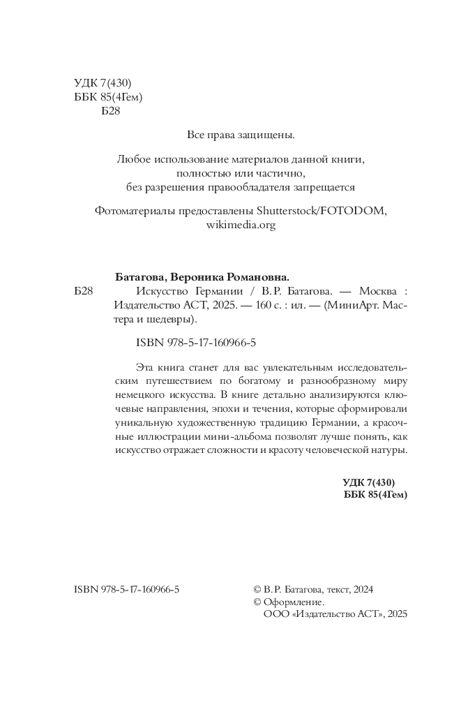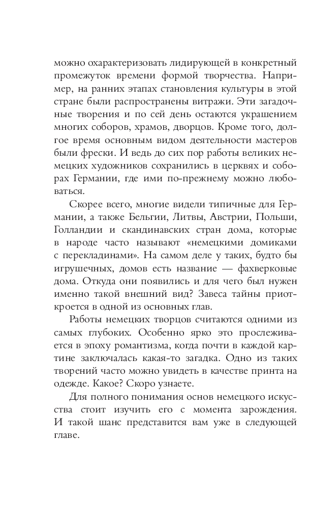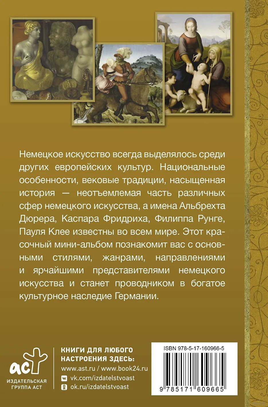Эта книга станет для вас увлекательным исследовательским путешествием по богатому и разнообразному миру немецкого искусства. В книге детально анализируются ключевые направления, эпохи и течения, которые сформировали уникальную художественную традицию Германии, а красочные иллюстрации миниальбома позволят лучше понять, как искусство отражает сложности и красоту человеческой натуры.
