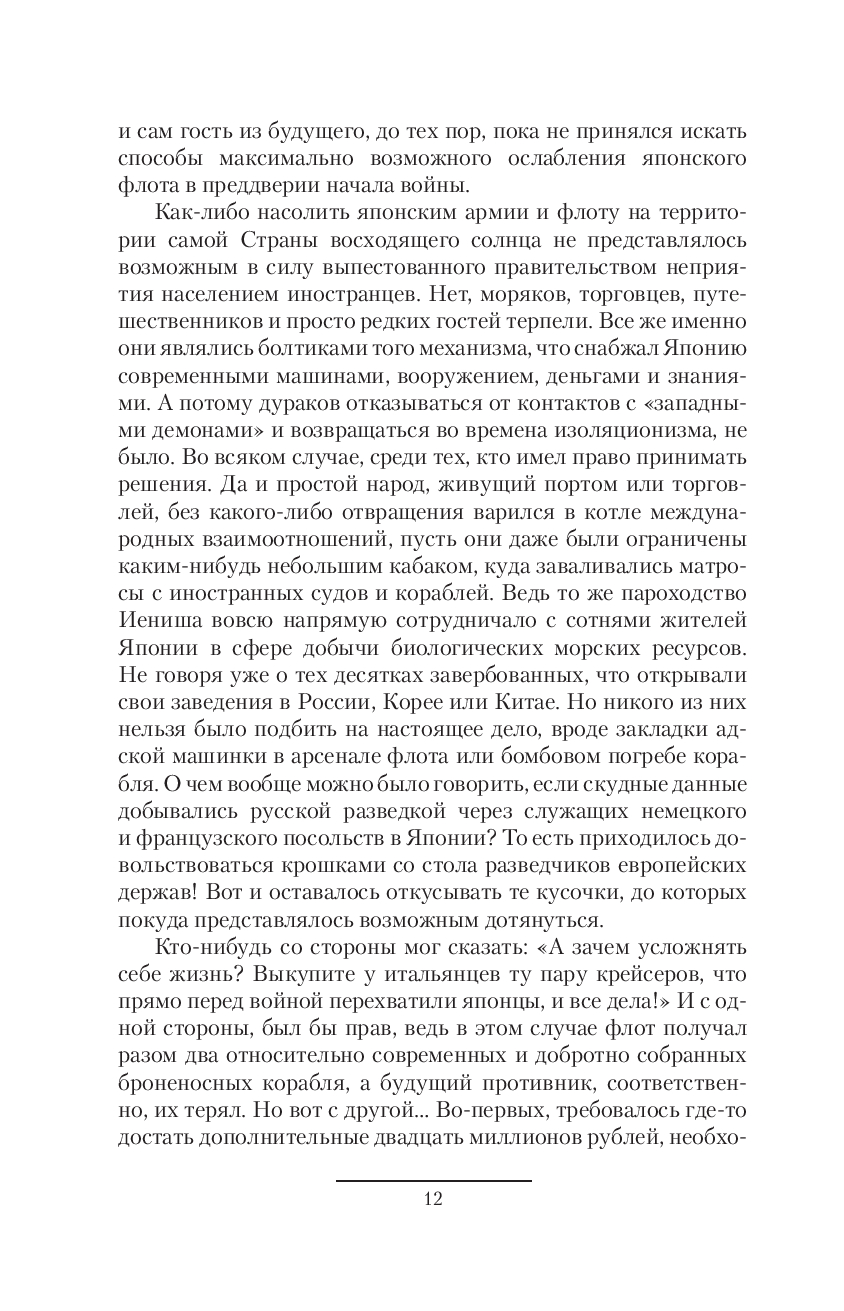 Две войны, что русско-японская, что Первая мировая, являлись неизбежными для Российской империи. Слишком уж много интересов немалого числа власть имущих оказались направлены на максимально возможное ослабление России через вовлечение ее в данные противостояния. И никакие изменения, произошедшие из-за вмешательства пришельца из будущего, как внутри самой страны, так и за ее пределами, не могли уберечь ее от грядущих испытаний на прочность. Но ход истории уже несколько сменил вектор своего движения благодаря тем сдвигам, что стали итогом многолетнего труда патриотов своей страны. На сей раз у императора всероссийского имеется четкое понимание, для чего это надо ему самому и его народу. На сей раз Россия подготовилась не к "легкой прогулке", а к тяжкому противостоянию с равными противниками. Теперь же дело остается за малым – не только победить видимых врагов, но и обыграть якобы союзников на их же игровом поле. А флот... Что же, он постарается внести свою лепту в общее дело. Тем более что имеется, чем, кому и кого бить.