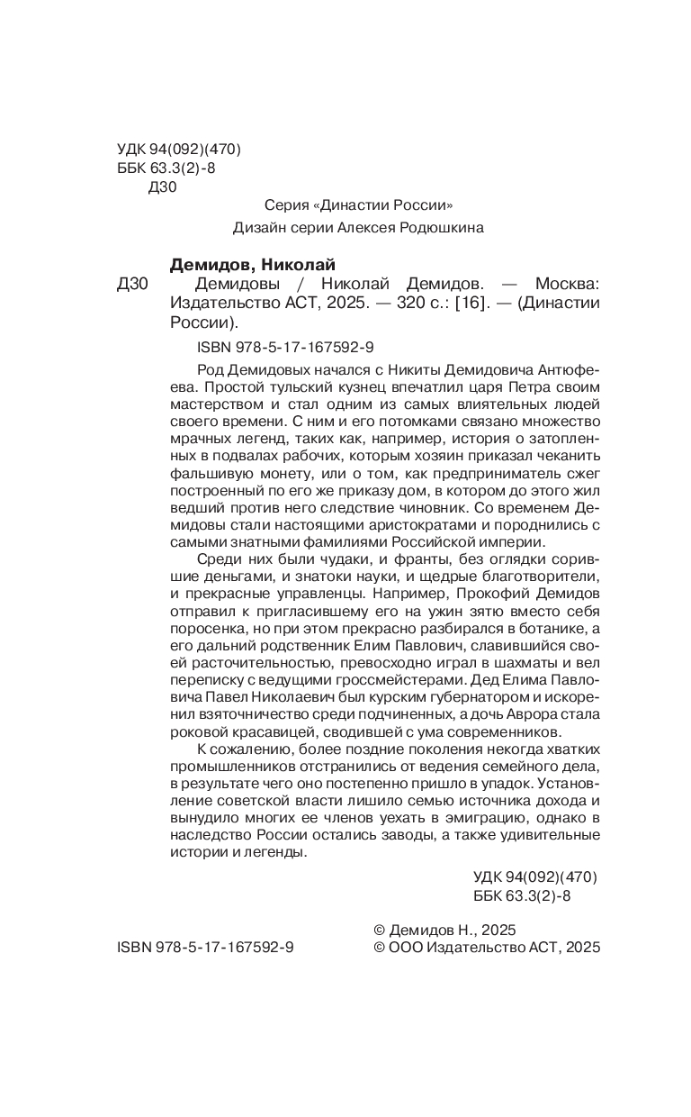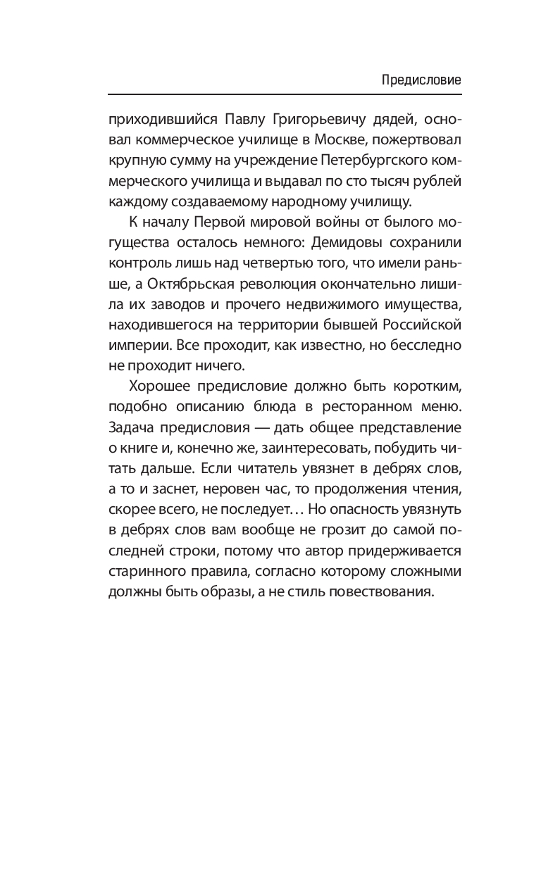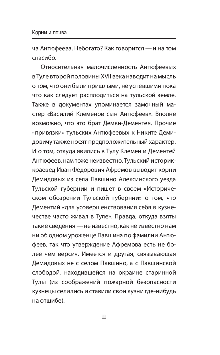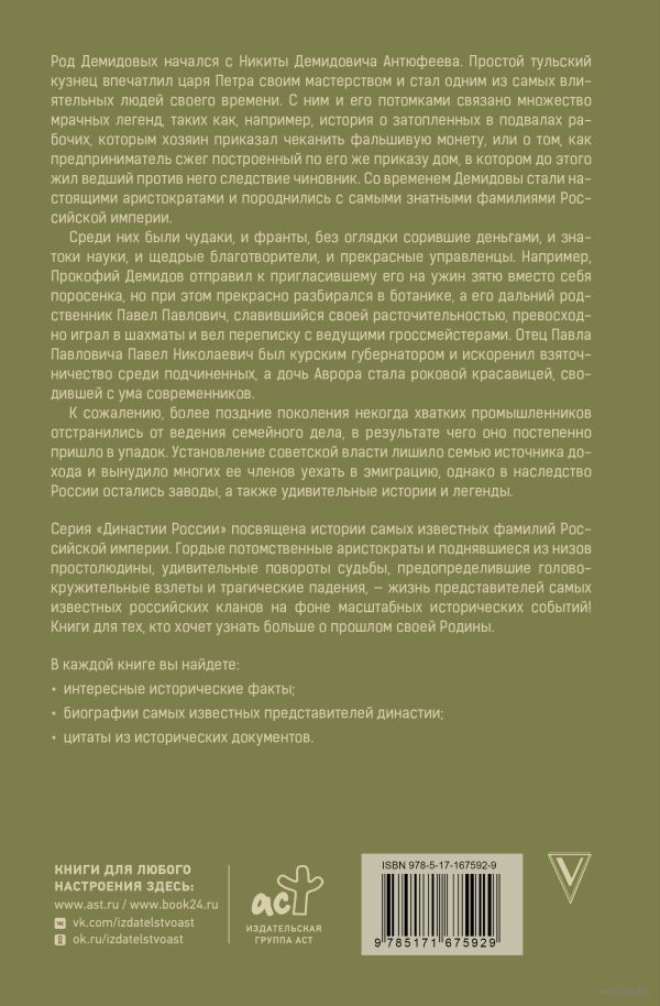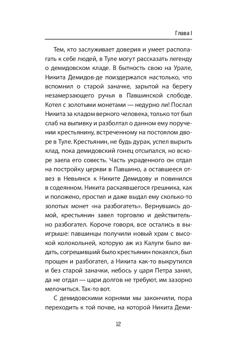 Род Демидовых начался с Никиты Демидовича Антюфеева. Простой тульский кузнец впечатлил царя Петра своим мастерством и стал одним из самых влиятельных людей своего времени. С ним и его потомками связано множество мрачных легенд, таких как, например, история о затопленных в подвалах рабочих, которым хозяин приказал чеканить фальшивую монету, или о том, как предприниматель сжег построенный по его же приказу дом, в котором до этого жил ведший против него следствие чиновник. Со временем Демидовы стали настоящими аристократами и породнились с самыми знатными фамилиями Российской империи.