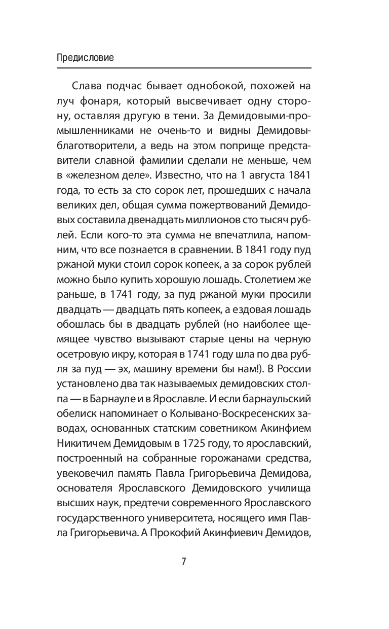 Среди них были чудаки, и франты, без оглядки сорившие деньгами, и знатоки науки, и щедрые благотворители, и прекрасные управленцы. Например, Прокофий Демидов отправил к пригласившему его на ужин зятю вместо себя поросенка, но при этом прекрасно разбирался в ботанике, а его дальний родственник Павел Павлович, славившийся своей расточительностью, превосходно играл в шахматы и вел переписку с ведущими гроссмейстерами. Отец Павла Павловича Павел Николаевич был курским губернатором и искоренил взяточничество среди подчиненных, а дочь Аврора стала роковой красавицей, сводившей с ума современников.